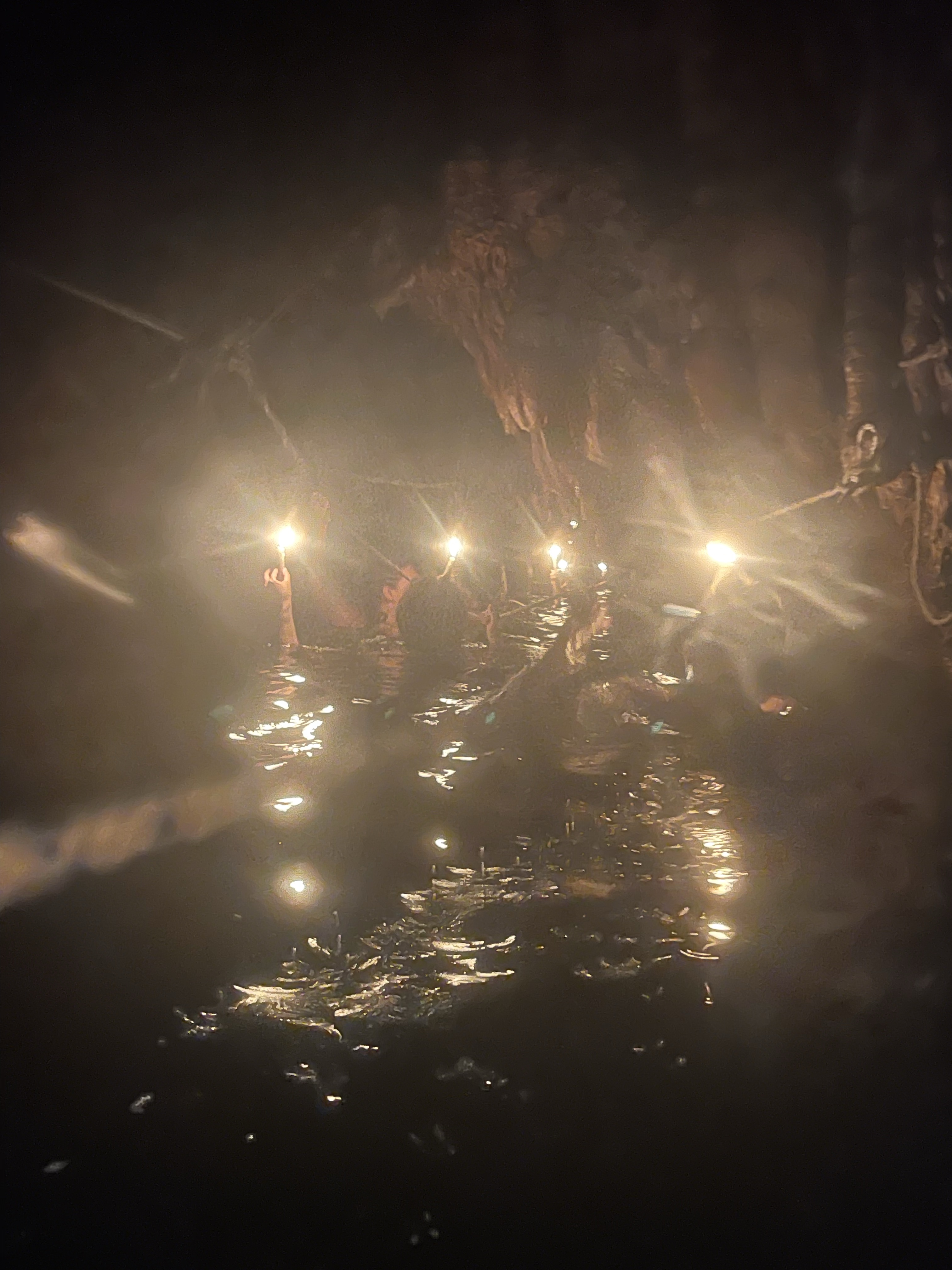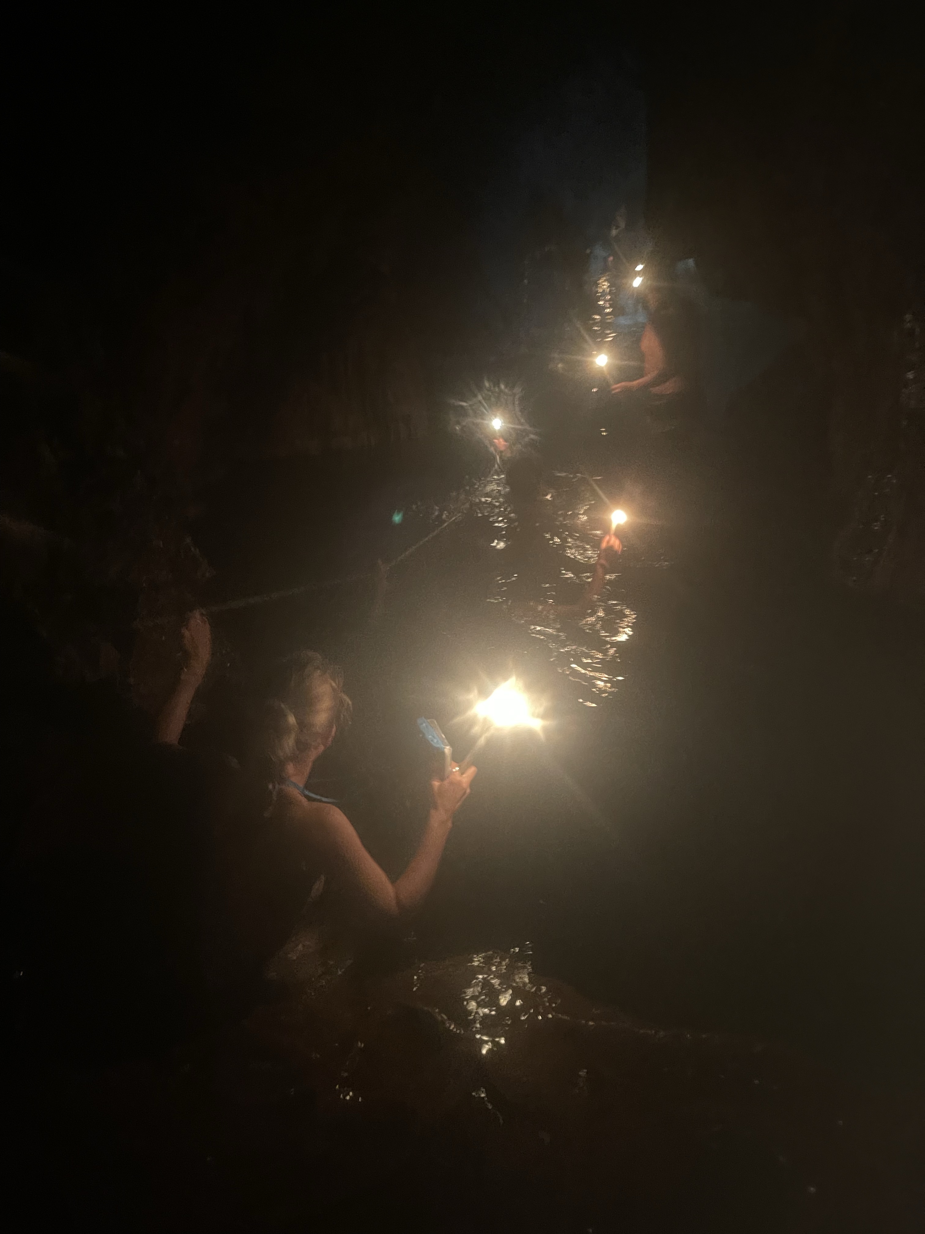 Wir wandern ca. 500 m in pechschwarze (klar, kommt ja kein Licht rein) Höhlen. Mit dabei: Kerzen. Die machen aber deutlich weniger hell als man meint, nämlich gar nicht. Unser Guide hat aber eine Kopflampe, die tut den Job. Die Kerzen sind eigentlich nur für die Atmosphäre da, und der Trick funktioniert. Die vielen Kerzenlichter in der Höhle sehen ziemlich cool aus. Am Ende der 500 m dürfen wir eine kleine Klippe innerhalb der Höhle runterspringen bevor es wieder zurückgeht.
