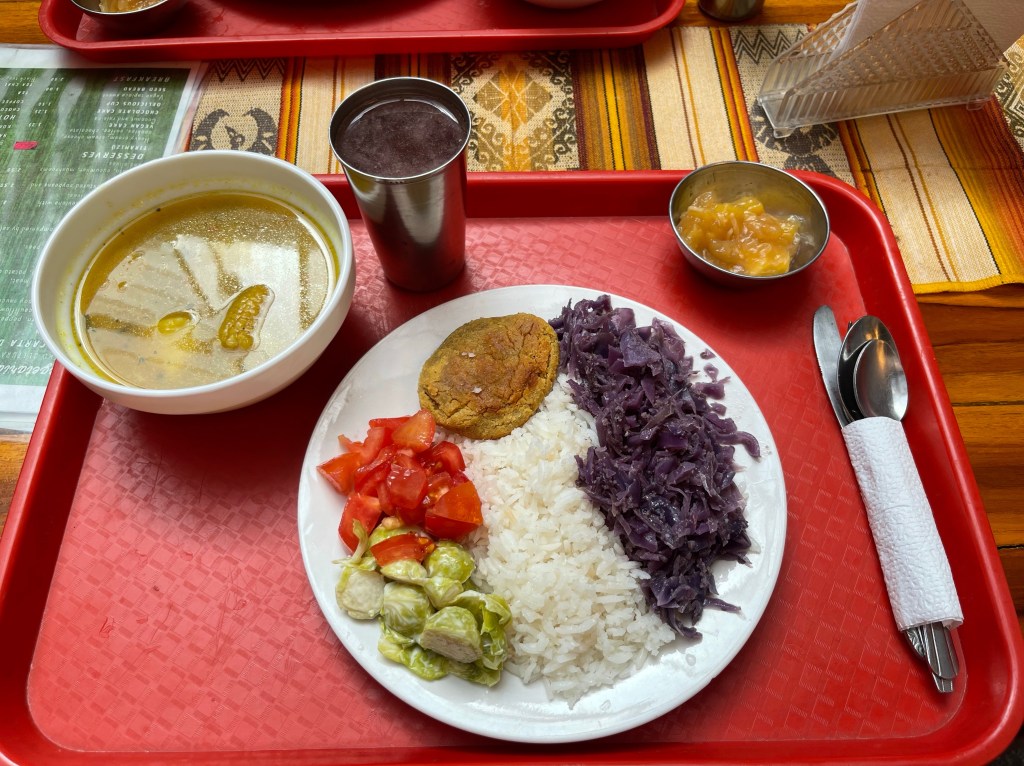 Als wir am späten Nachmittag das Hotel verlassen wollen, kommt uns ein Angestellter nachgerannt und fragt, ob wir Bescheid wüssten. Äh, nö? Wegen der Proteste der indigenen Bevölkerung (hatte der Taxifahrer ja schon erwähnt)… Wir sollen dringend aufpassen, das kann gewalttätig werden. Es kann sein, dass Dinge nach uns geworfen würden oder dass man ausgeraubt wird. Und wir haben Glück, unser Hotel liegt genau am Rand der historischen Altstadt – also genau dort wo so richtig protestiert wird, hier liegen nämlich die Regierungsgebäude. Träumchen! Mit diesen Worten verlassen wir also das Hotel und spazieren los in Richtung Altstadt zu einem Hare Krishna Tempel, da ist nämlich ein veganes Restaurant drin. Needless to say, ich fühle mich richtig wohl während wir so spazieren. Mit einem Auge schaue ich immer um uns herum, was und wer gerade da ist. Dann nur noch einmal die Rotlichtstraße entlang und wir sind auch schon da. Das waren lange 15 Minuten zum Restaurant.
