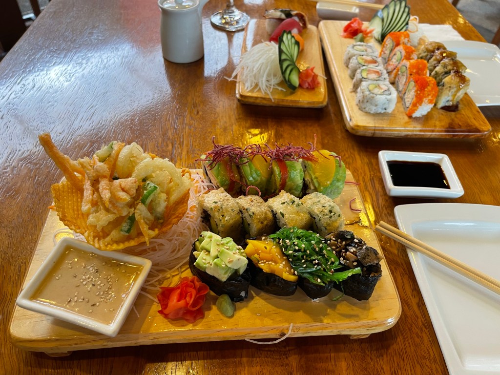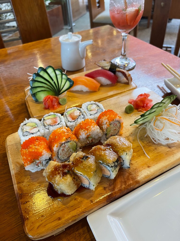 Wir fahren also mit dem Taxi in den Norden der Stadt in eine Mall (die Stadt dehnt sich auf ca. 30km aus und hat rund 3 Mio. Einwohner). Dort gibt es Kino, Sushi Laden und Bankautomat. Alles in einem Stop erledigt. Wir schauen uns den neuen Top Gun mit Tom Cruise an (auf englisch) und essen danach jede Menge Sushi.