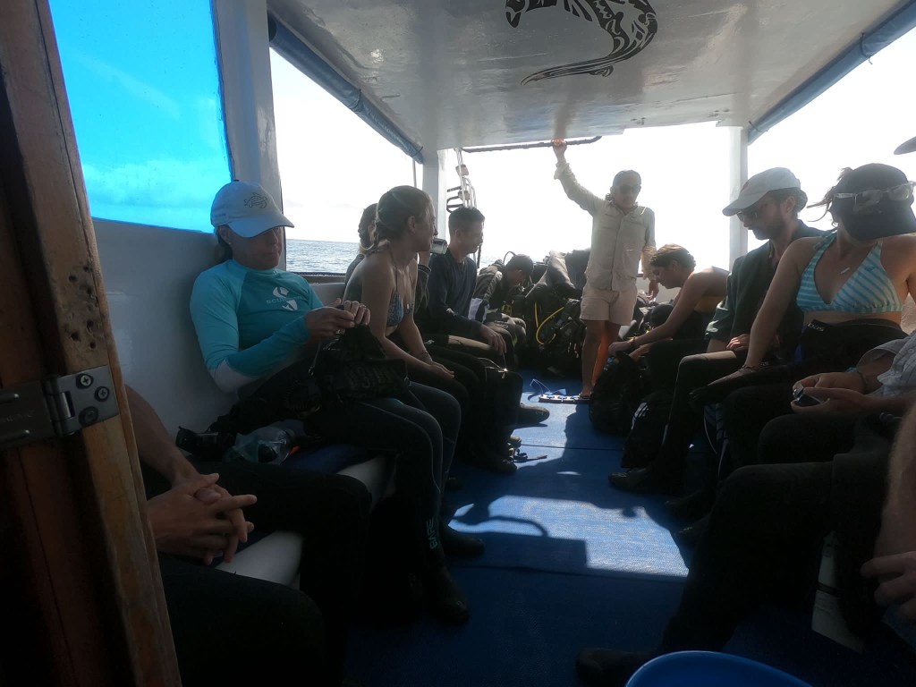 Wir stellen uns im Boot außerdem alle einmal vor, wie wir heißen, woher wir kommen, was wir heute sehen möchten und wieviele Dives wir schon haben. Wir sind 10 Taucher insgesamt, davon haben 4 über 100 Tauchgänge absolviert, 3 Personen sind bei 50+ Dives. Und eine Schweizerin mit 25 Tauchgängen. Mit unseren gerade mal 10 Dives sind Ben und ich also die Rookies im Boot. Wird schon werden. Wir werden danach in zwei Gruppen nach Erfahrungswerten aufgeteilt, so dass ein Guide je 5 Teilnehmer bei sich hat.