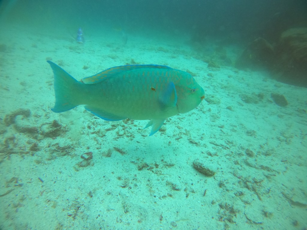 Wir starten in Mosquera, neben bunten Fischschwärmen werden wir mit Papageifischen, Rochen und zwei großen Galapagoshaien (ca. 4m meint unser Guide) belohnt. Tauchgang 1 hat schon richtig viel Spaß gemacht, obwohl mein Regulator seltsame Geräusche gemacht hat und irgendwann langsam aber sicher Wasser reingetröpfelt ist, nachdem das komische Pfeifen aufgehört hatte.