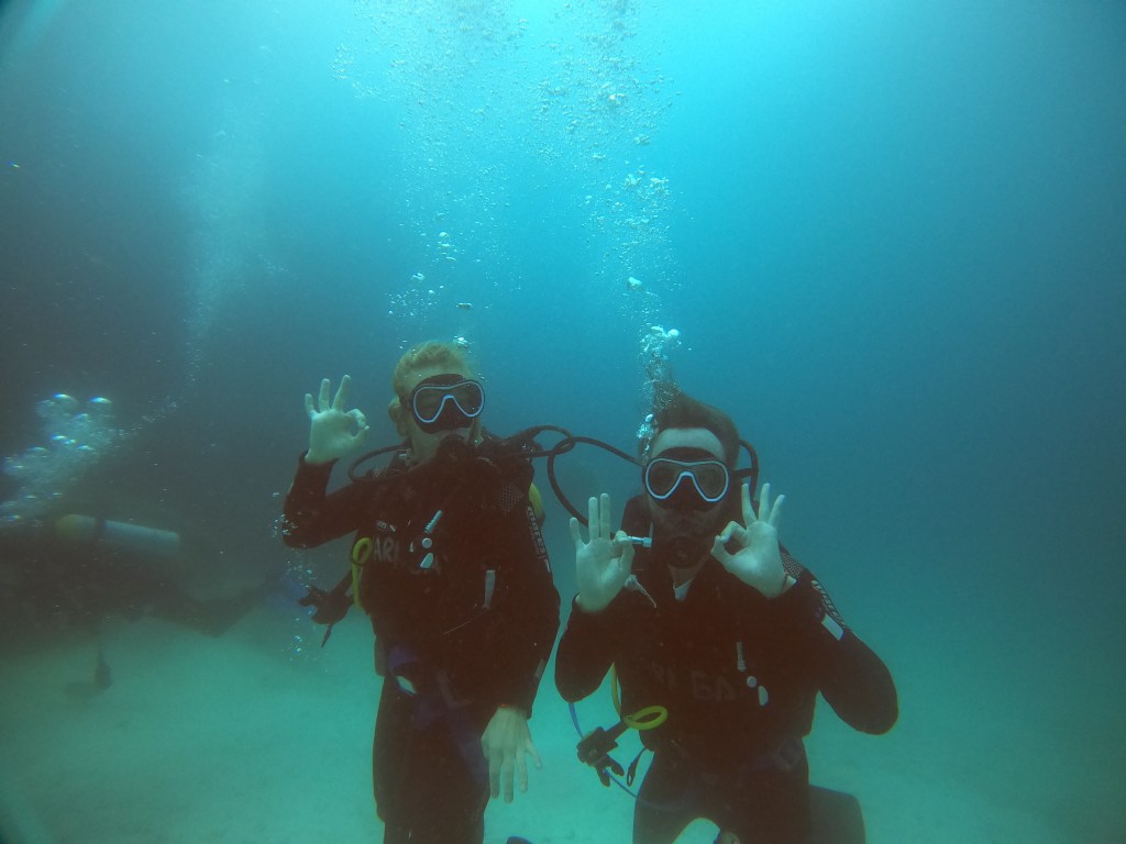 Wir sitzen alle eingepackt mit Maske auf der Nase und Regulator im Mund auf der Kante und halten uns fest. Unser Guide zählt. 3, 2, 1 , GO! Wir lassen alle gleichzeitig los und purzeln rückwärts ins Wasser. Wir schwimmen mit dem Guide durch die Wellen noch näher an die Kraterwand. Ein Franzose wird auf mich draufgeschwemmt, ich lande kurz danach auf Ben. Scusi, keine Absicht, Welle war zu groß. Als alle beieinder sind, lassen wir die Luft aus den Westen und sinken gemeinsam ab. Es geht erstaunlich gut diesmal mit meinem rechten Ohr, mein Regulator pfeift auch nicht… es ist wirklich alles bestens.