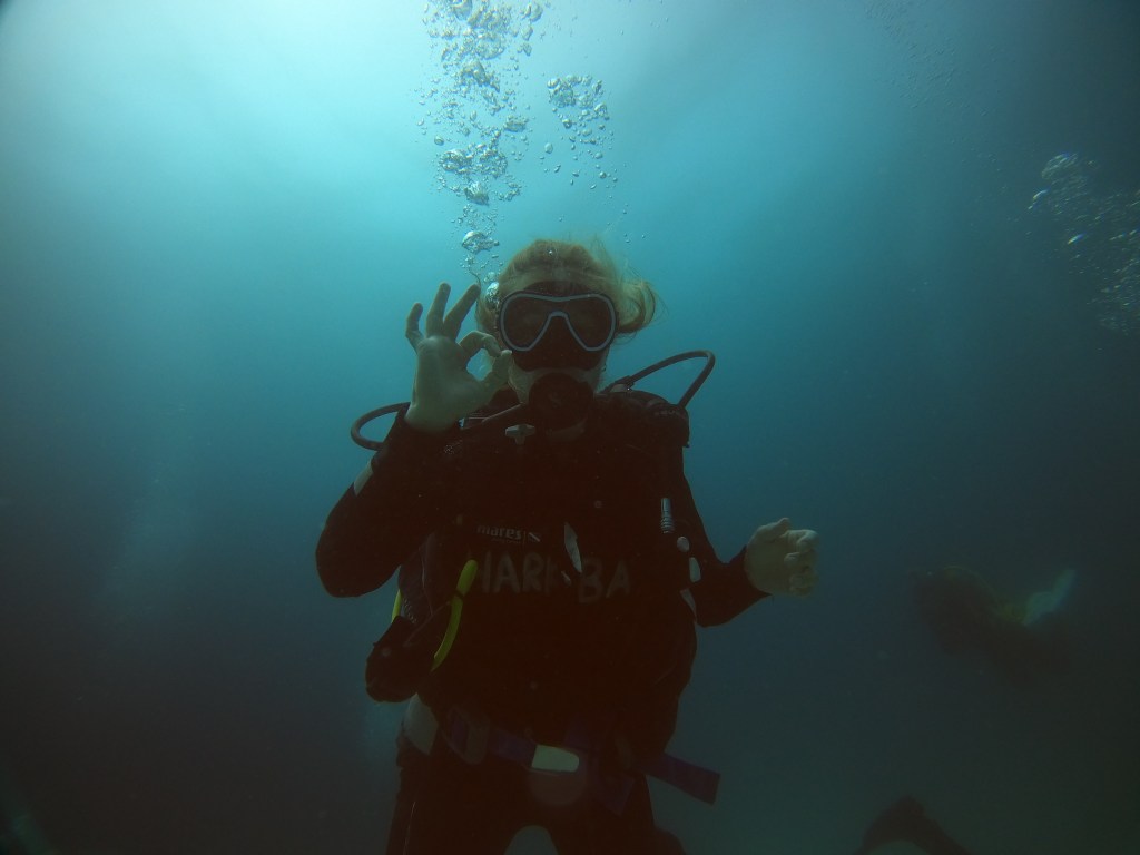 Über Wasser berichtet sie, dass ihr schwindelig geworden ist. Vermutlich eine Kombination aus Anstrengung (Schwimmen gegen Strömung) und Schwierigkeiten beim Atmen (je tiefer man ist, desto schwerer wird auch das Atmen der immer stärker komprimierten Luft). Zurück im Boot geht es ihr allerdings schnell wieder besser und alles ist gut.