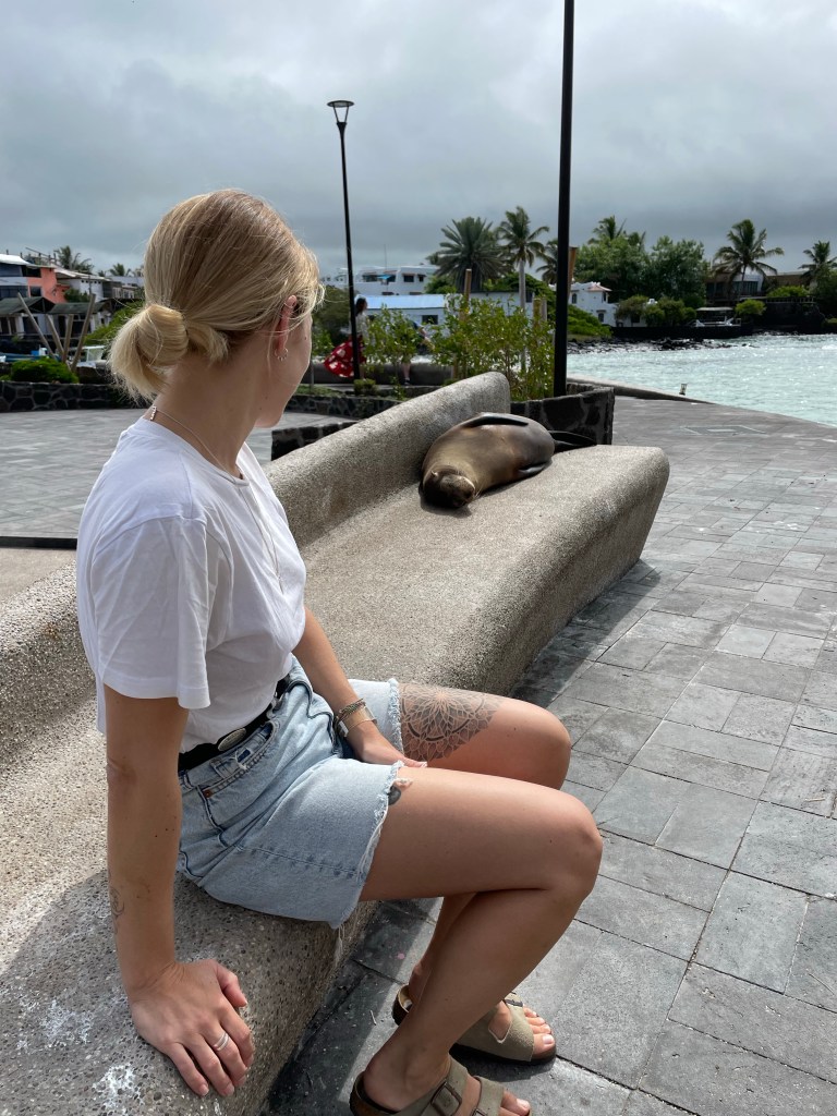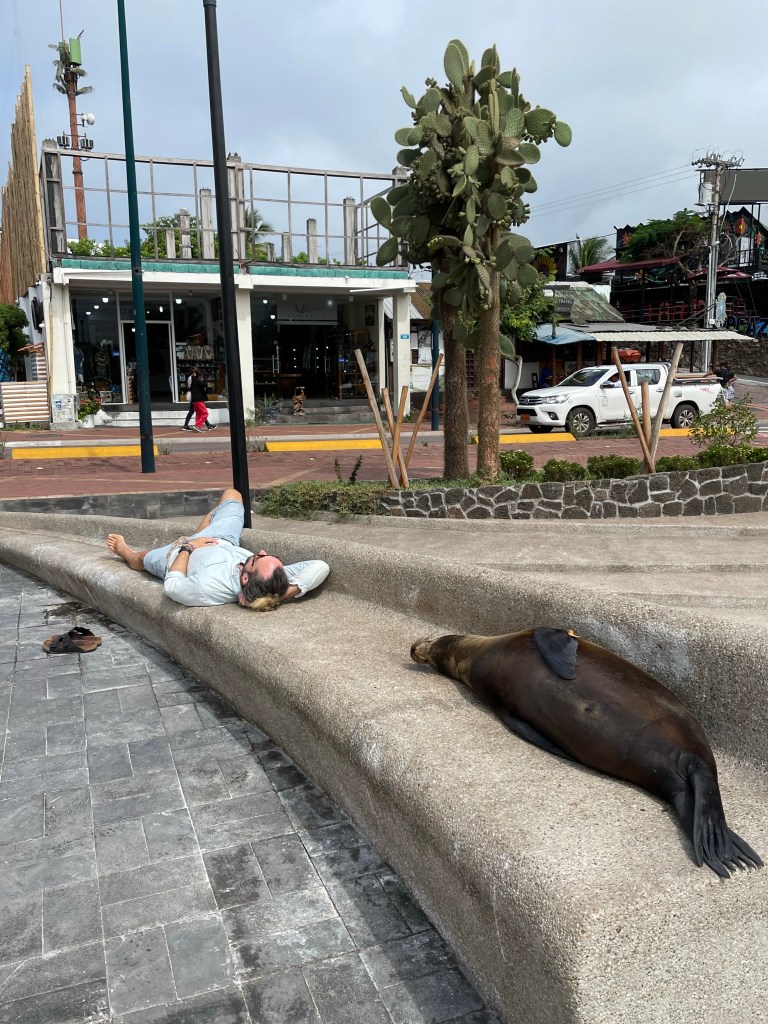 Aber: Unverhofft kommt oft, so sind wir erst in Ecuador gelandet. Und wegen der Proteste auf dem Festland sind wir irgendwie direkt auf die Inseln „gespült“ worden… Und wenn man denn schonmal ins Paradies stolpert (anders kann man das in unserem Fall wirklich nicht bezeichnen), dann muss das unabhängig von der Wetterlage zelebriert werden. Und Wolken hin oder her, es ist wirklich ein Traum hier. Wie oft sieht man schon Robben in freier Wildbahn, geschweige denn auf einer Steinbank in einer „Fußgängerpromenade“?!