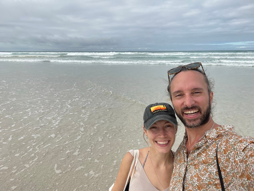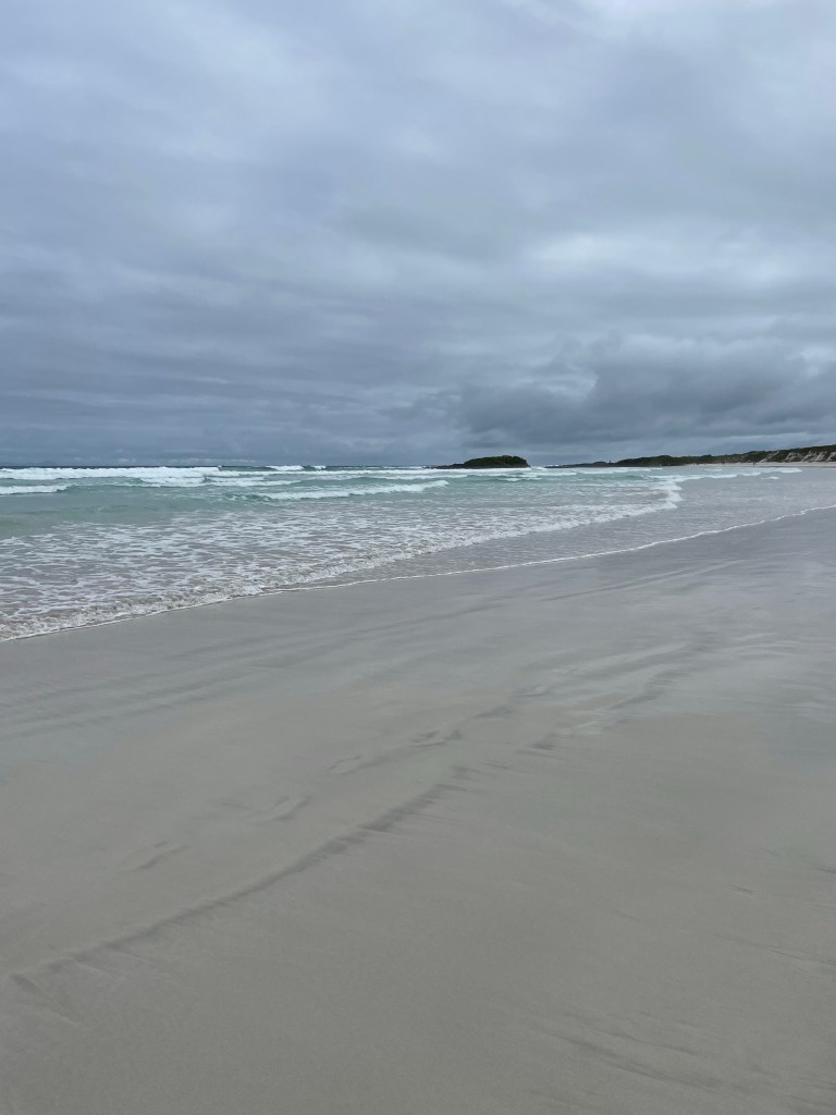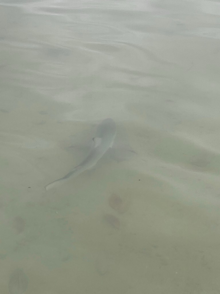 Wir besuchen zur Vorbereitung wunderschöne Strände, aber das Wasser ist mir definitiv zu kalt zum Schnorcheln. Stattdessen waten Ben und ich etwas mehr als knietief ins Wasser – reicht auch. Ist erstens kalt genug und zweitens kann man schon so wunderbar alle möglichen Fische beobachten, die kommen nämlich zuverlässig zum Futtern angeschwommen, wenn wir beim Laufen den Sandboden aufwirbeln. Einmal schwimmt sogar ein kleiner Black Tip Hai an uns vorbei im seichten Wasser.