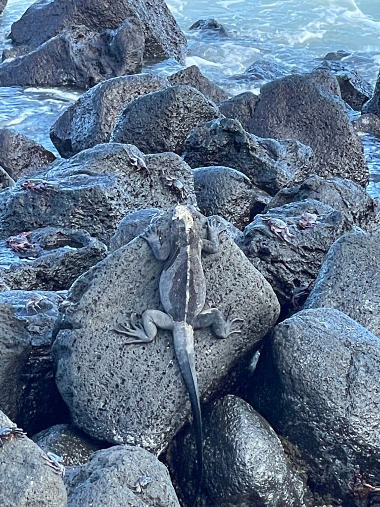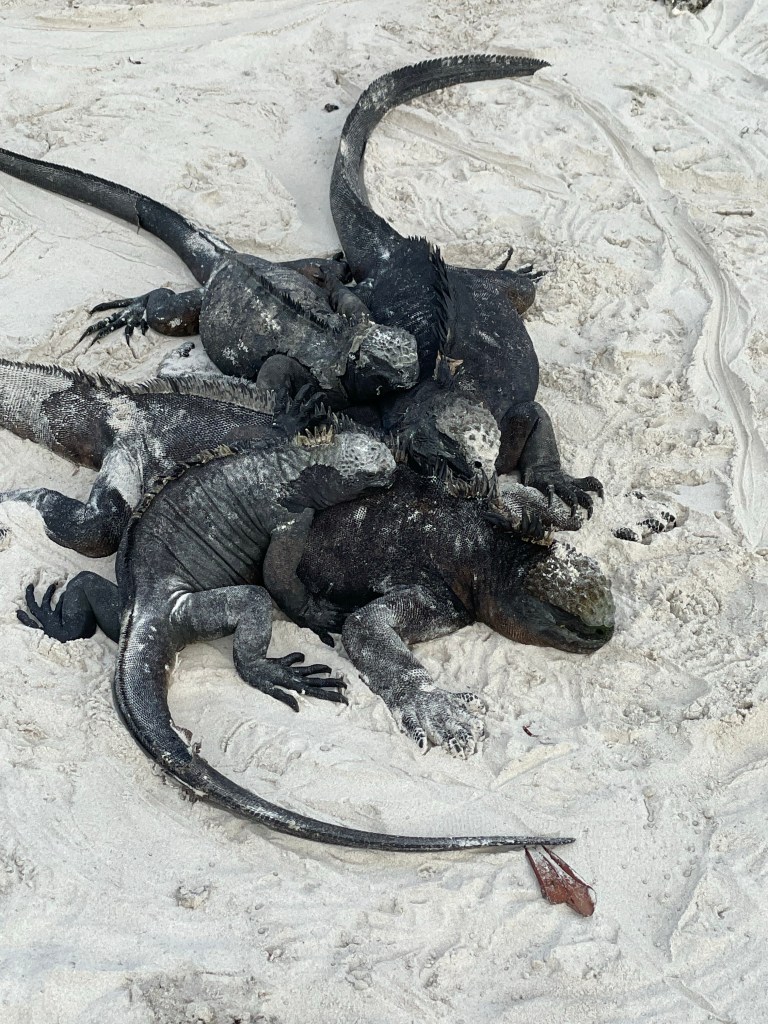 Neben all den Fischen und Robben sehen wir hier auch haufenweise Iguanas. „Haufenweise“ nicht nur, weil wir viele davon sehen, sondern auch weil sie oftmals wirklich auf einem Haufen beieinander liegen.