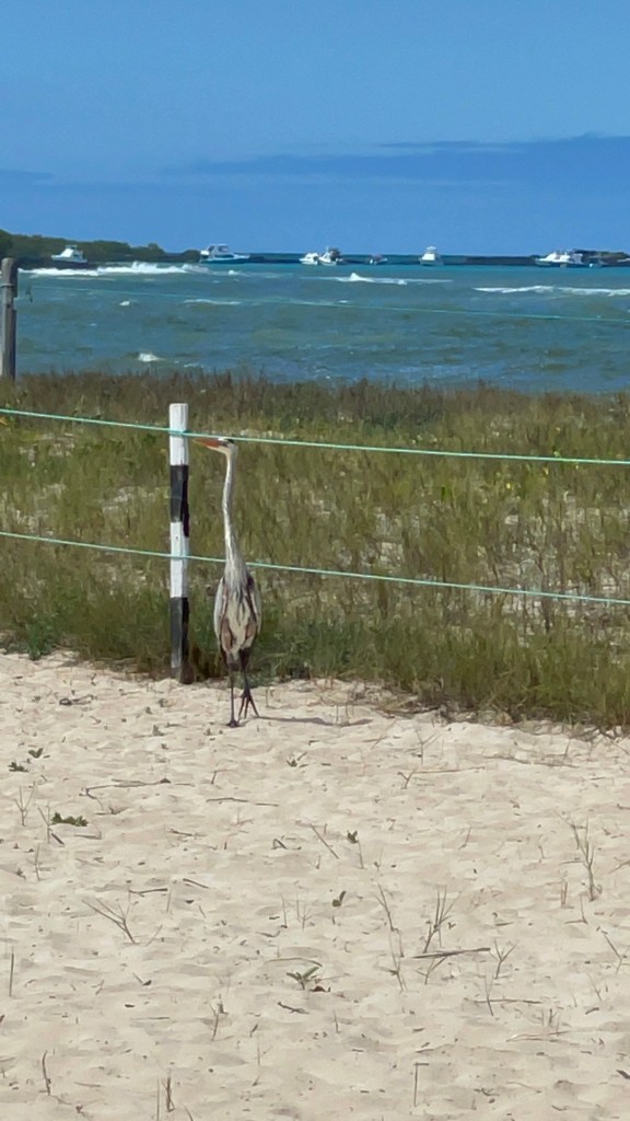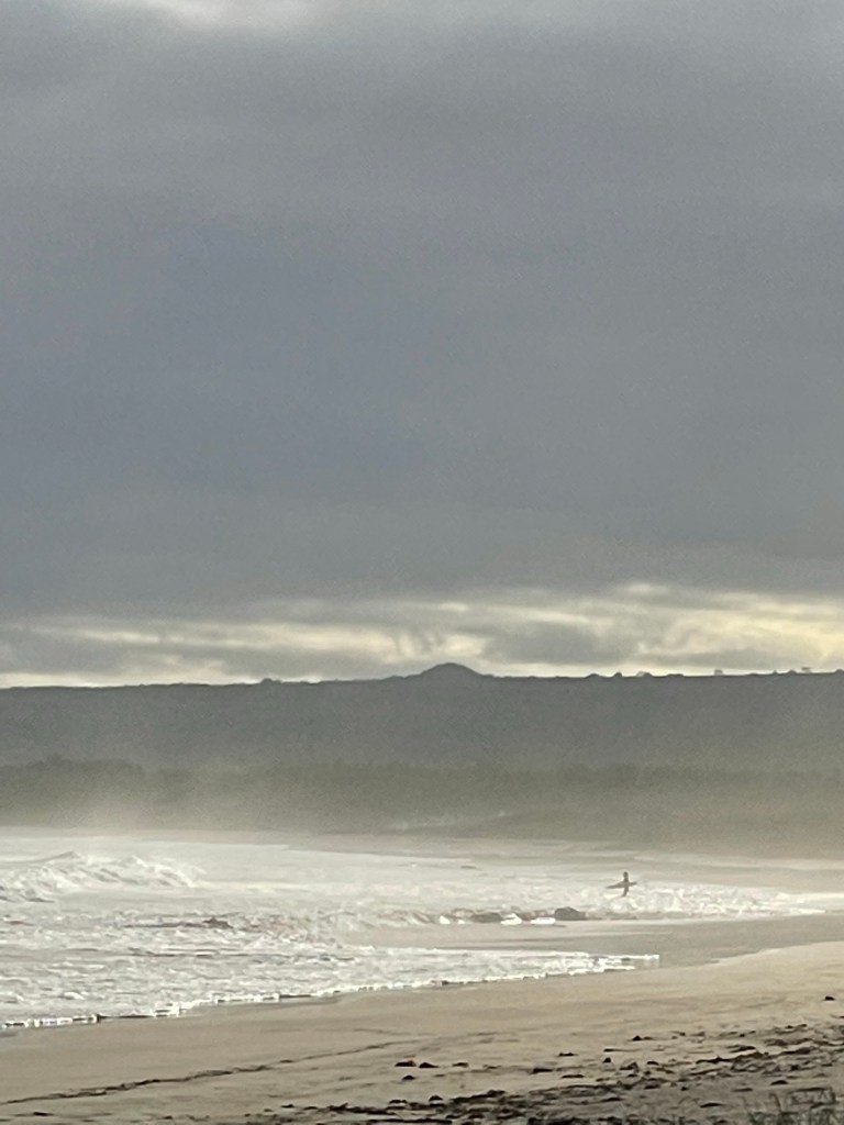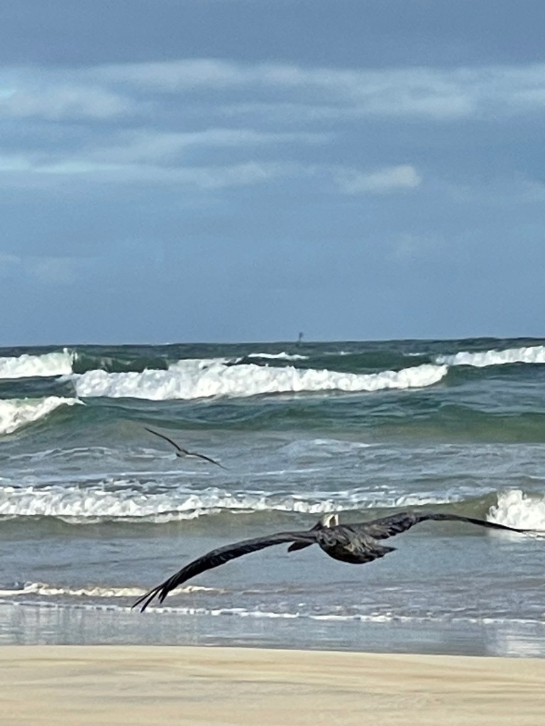 Auf dem Rückweg vom Inselinneren in Richtung Strand finden wir einen schönen Abschnitt mit Surfern. Etwas abseits davon ist der Sand unberührt. Man sieht die Surfer noch und kann gleichzeitig die Tiere um sich herum beobachten. Drei Pelikane sitzen quasi vor unserer Nase im Wasser und jagen abwechselnd. Eine Robbe kommt auch vorbeigeschwommen.