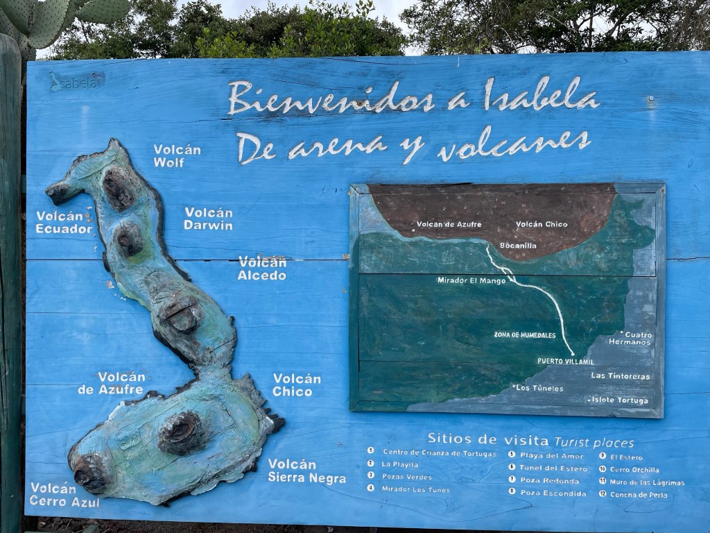 Isabela ist die größte Insel des Galápagos Archipels, sie nimmt knapp 60 % der gesamten Landmasse ein. Isabela ist damit etwa fünfmal so groß wie die Insel von der wir gerade kommen – und hat nicht mal ein Fünftel der Bevölkerung (~2.200 Personen leben hier auf Isabela).