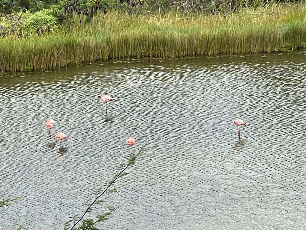 Wir besuchen noch einen kleinen Teich in der Nähe des Schildkrötencenters und beobachten Flamingos. Viel zu beobachten gibt es aber nicht, denn die rosafarbenen Freunde schlafen (wenn auch in gewöhnungsbedürftiger Haltung mit Knoten im Hals).