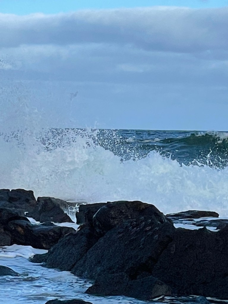 Es ist schon relativ spät am Nachmittag, die Sonne zeigt sich, aber sie steht schon tief. Der Winkel macht das Licht perfekt, man kann sehen wie der Wind nicht nur die Wellen an Land treibt, sondern auch wie feine Wassertröpfchen nebelartig vom Wind um die Surfer geweht werden.