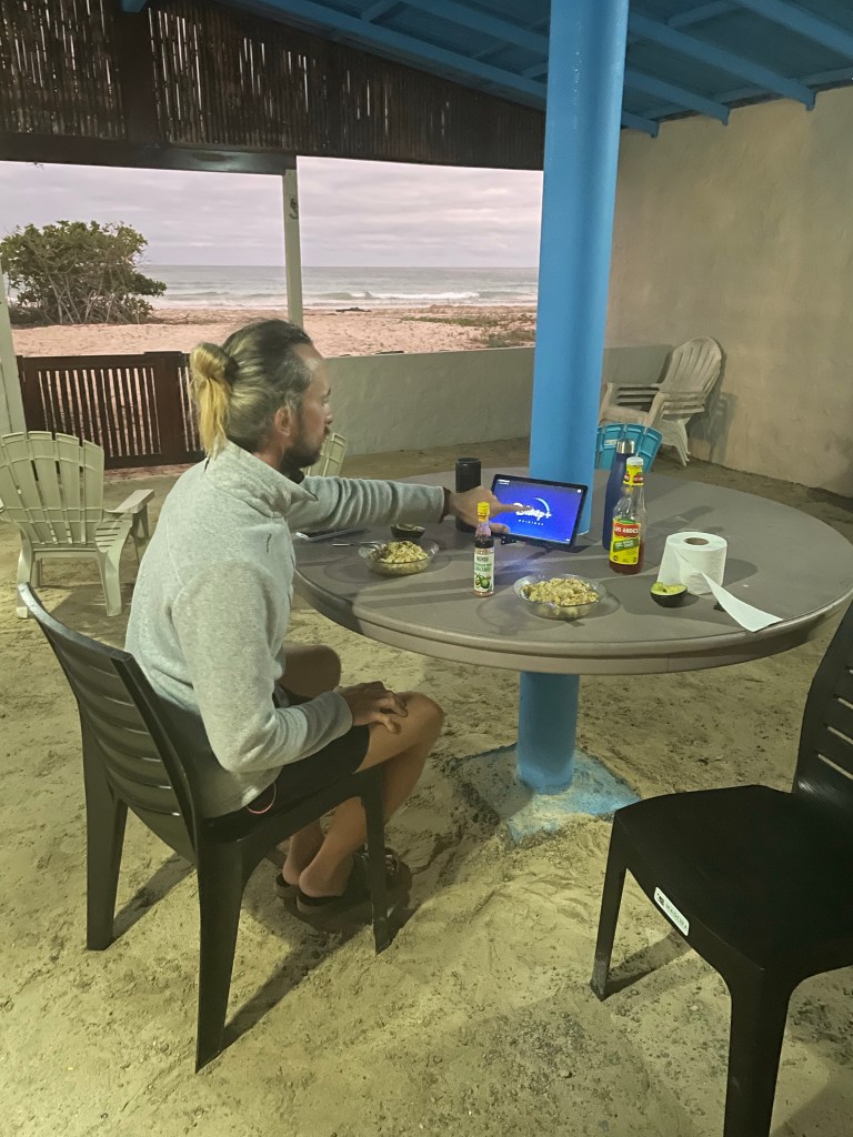 Die ersten zwei Tage ist es kühl, windig und sehr bewölkt, also nur mittelmäßig gemütlich. Ist eben auch hier nicht die Hauptsaison. Macht aber nichts, wir haben einen Tisch im Zimmer und beschäftigen uns am Laptop. Offline jedenfalls, das Internet ist nicht besonders gut und bei Wolken quasi nicht vorhanden. Nervt zwar ein bisschen, hilft aber auch beim Entspannen.