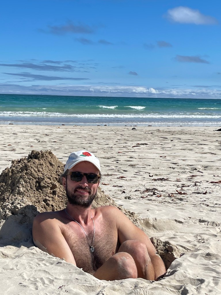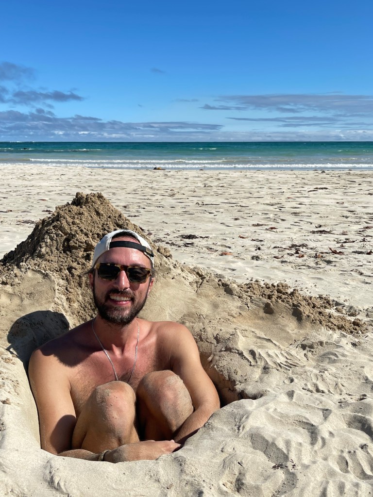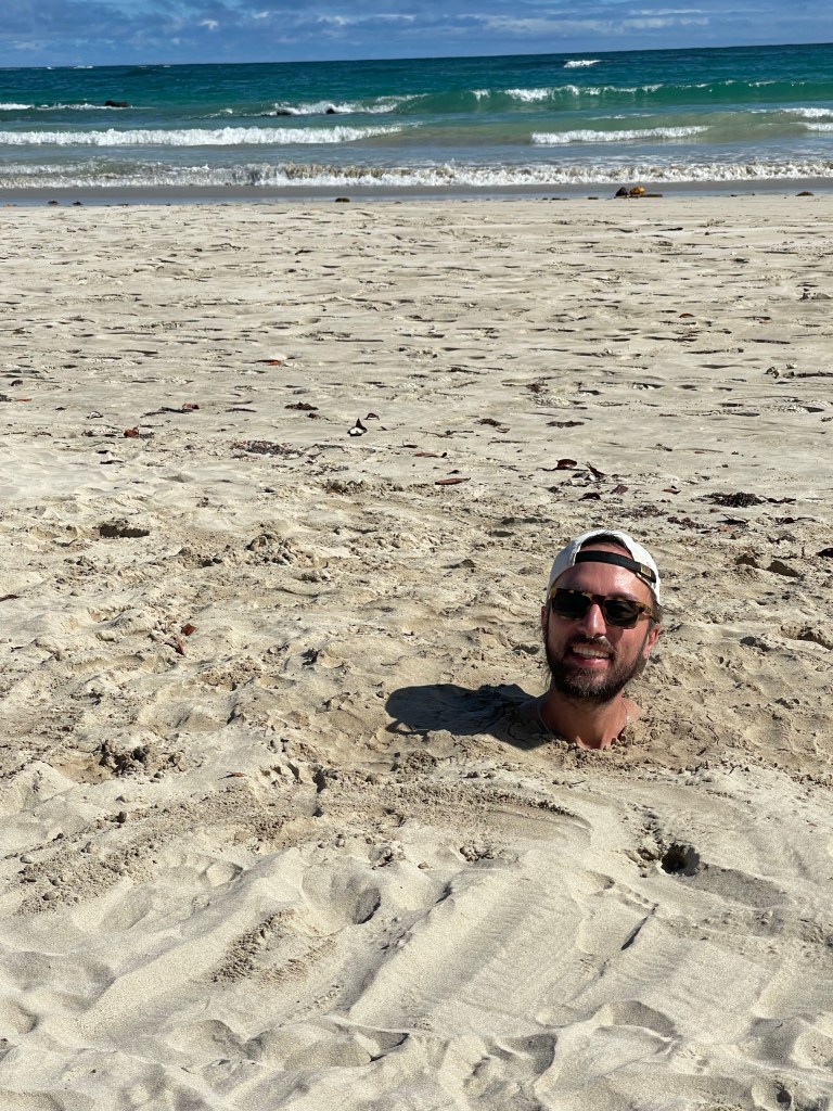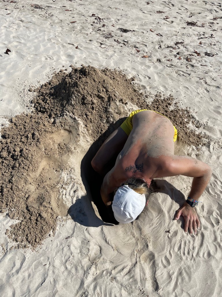 Das Resultat dieser Tagesaufgabe hat für viel Spaß und Sand in der Hose gesorgt. In so einem Sandloch sitzt es sich außerdem erstaunlich gut. Kurz hatte Ben sogar die Geschäftsidee, das Loch im Sand zu vermieten.
