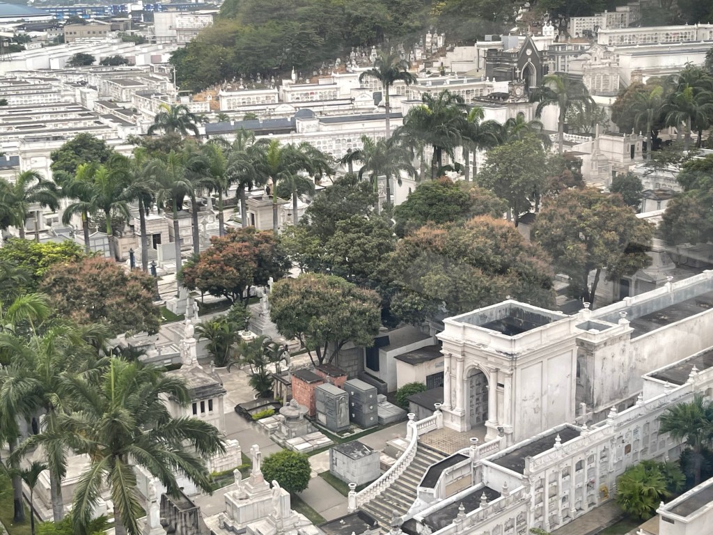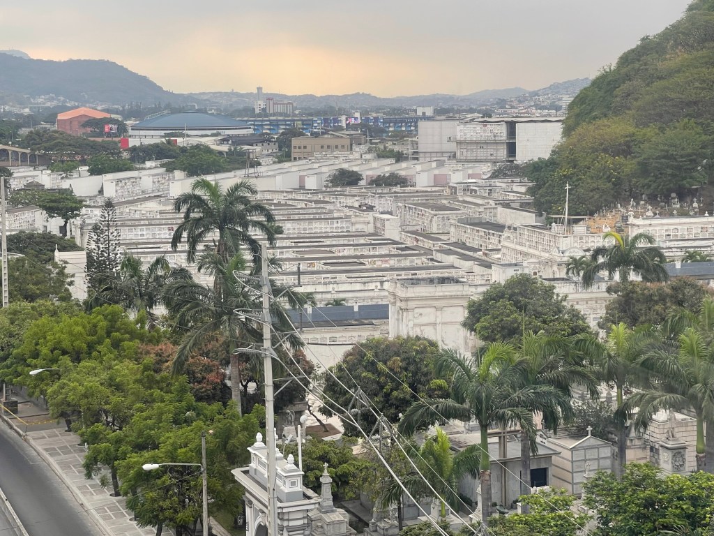 Danach gehen wir (im Hellen!) über den 1823 gegründeten Friedhof. Im Gegensatz zu den Friedhöfen zuhause wird in vielen südamerikanischen Ländern nach oben gebaut anstatt zu graben. Das Resultat beim Friedhof in Guayaquil: er ist enorm. Viele viele viele riesige Bauten mit Gräbern. Meist sechs Gräber hoch und über 20 Gräber lang… Wer mehr Geld hat(te), besitzt eine Krypta für die Familie. Und obwohl auch davon viele zu finden sind, so sind die Sammelbauten doch deutlich in der Überzahl.
