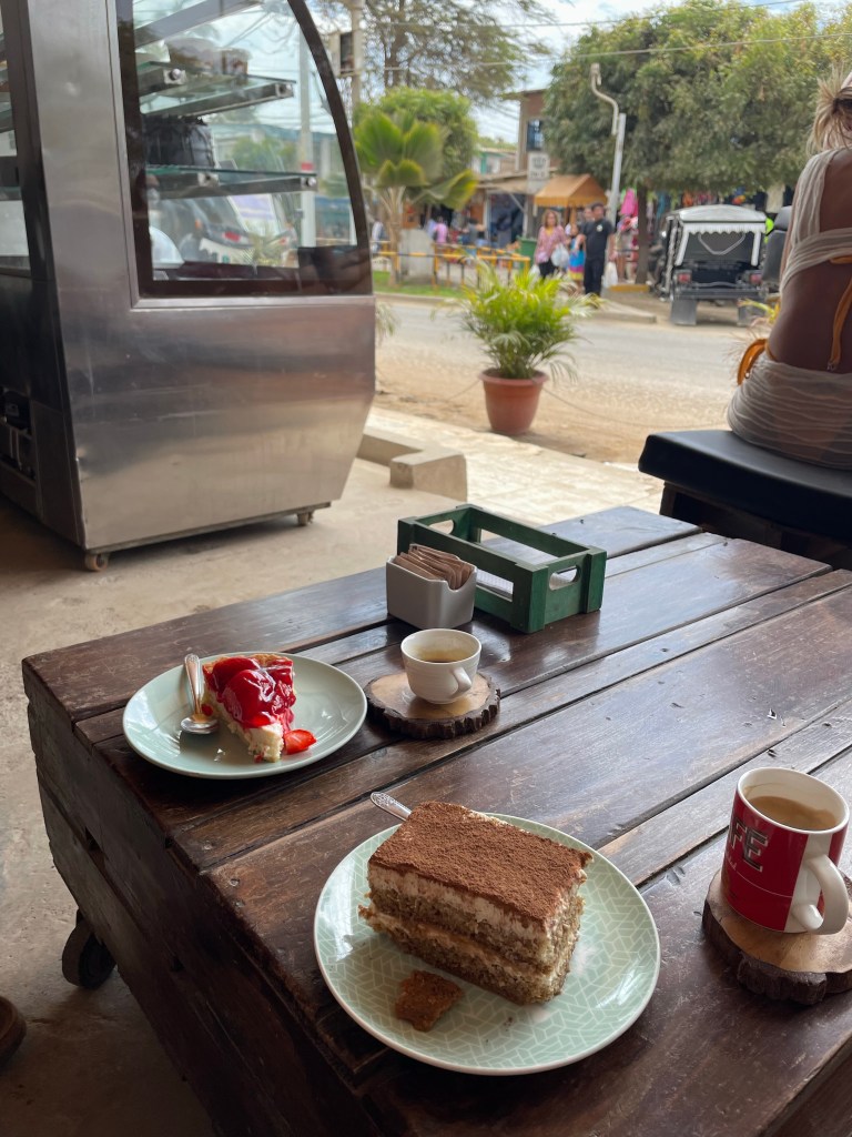 Das heißt wir konzentrieren uns vormittags auf unsere Onlineprojekte und Zukunftsplanung, und nachmittags auf Strandbesuche und den weltbesten Kuchen. Obwohl Máncora ja eher klein ist, haben wir ein Café gefunden indem wir ab seiner Entdeckung fast täglich sind. Der Espresso ist hervorragend und verdammt stark. Aber noch besser sind die Kuchen, ganz konkret: der Tiramisukuchen und der Karottenkuchen. Wenn ich dem Paradies einen Geschmack zuordnen müsste, einer der beiden Kuchen würd’s werden.