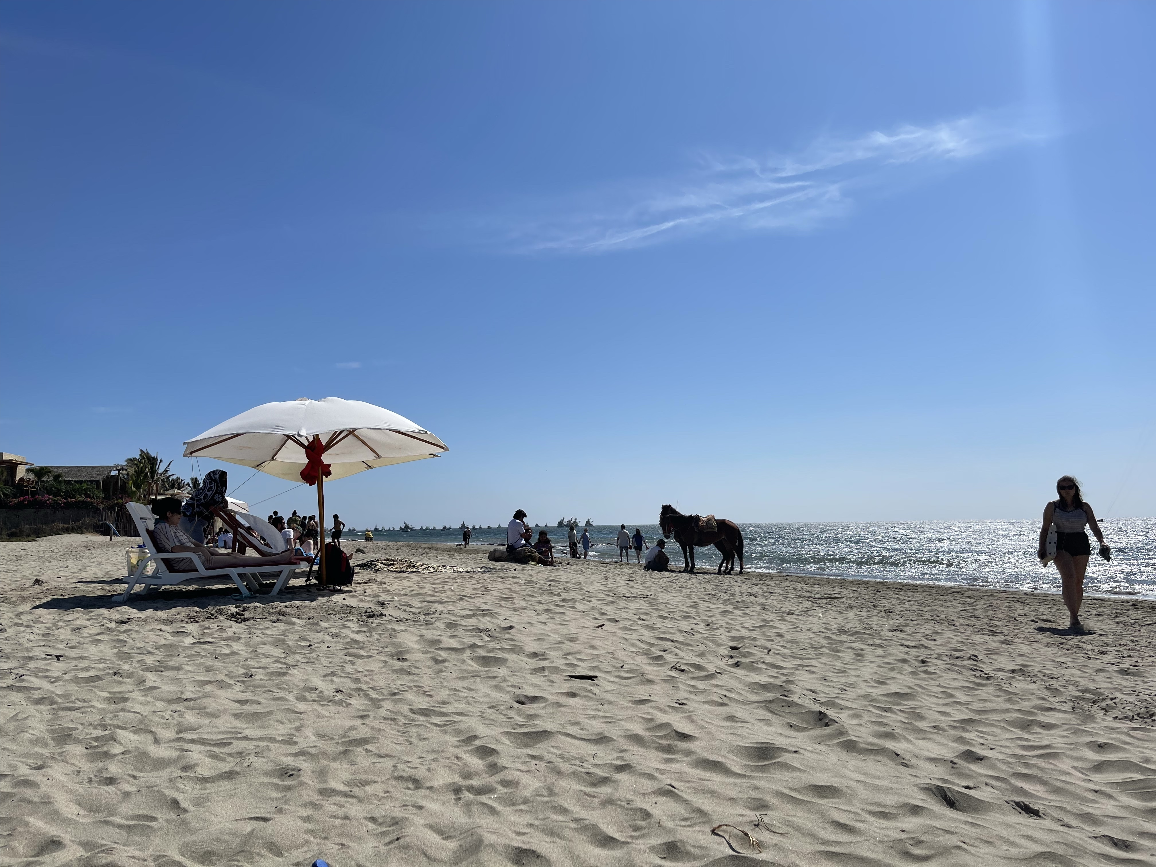 Nachmittags geht’s ab an den Strand. In der Sonne lässt es sich gut aushalten, es hat hier ziemlich konstant um die 26/27 °C. Am Strand bläst eine schöne Meeresbrise und so lässt es sich auch ohne Schatten gut liegen im weichen Sand. Selbstredend urdeutsch mit LSF50 eingecremt. Sonne is‘ ja schön, aber safety first und so.