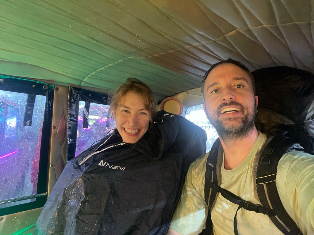 Die Busfahrt in Richtung unserer Unterkunft dauert vom Flughafen etwa eine Stunde und wir werden bei strömendem Regen begrüßt. Eigentlich nicht so schlimm, denn die Regenponchos haben wir sicherheitshalber dabei – aber eigentlich sollte keine Regenzeit sein?! Nunja, wir werden sehen was das Wetter bringt. Nicht umsonst haben sowohl Ben als auch ich Vollplastik-Badelatschen als unser zweites Paar Schuhe ausgewählt, die man wunderbar auch durch die Regenzeit und zum Waten durch knietiefe Pfützen tragen kann.