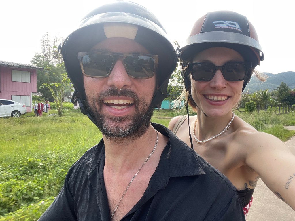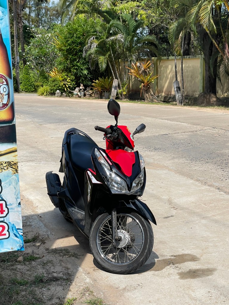 Den Roller haben wir uns schon am Vorabend besorgt und das Ding ist Thailand pur: er scheppert, hat Macken en masse, die Bremsen reagieren viel zu langsam und die Helme rutschen die ganze Zeit in den Nacken – wie ist mir ein Rätsel, aber es funktioniert!