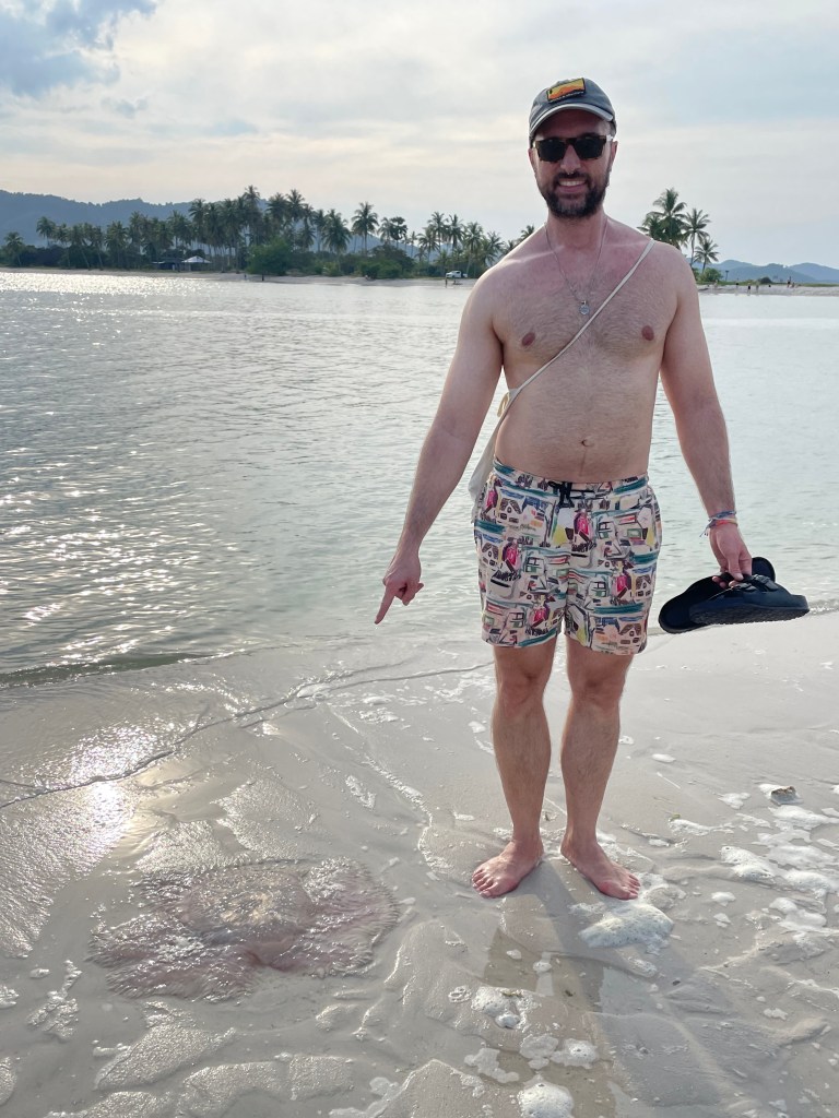 Auf dem Weg zur Sandbank entdecken wir nämlich jede Menge angespülte Quallen. Da es ein Sandstrand ist, ist das Wasser trüb – man sieht also nichts, obwohl das Wasser hier überall gerade mal knietief ist. Als wir endlich ziemlich am Ende der Sandbank ankommen, finden wir dann auch noch dieses Prachtexemplar: