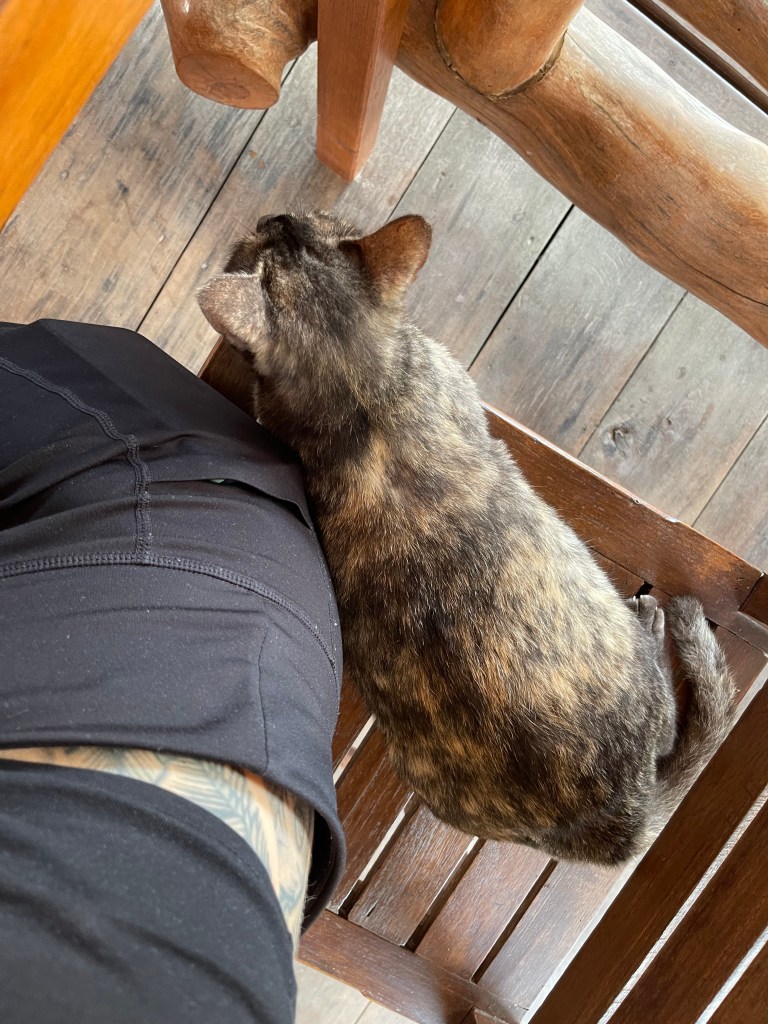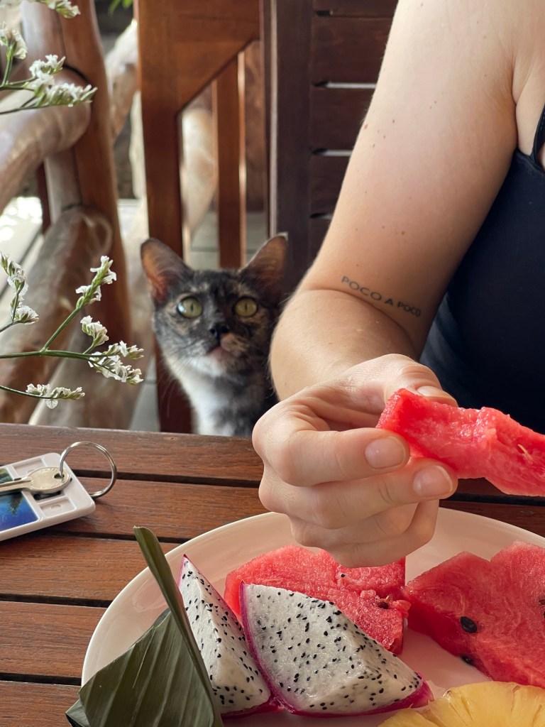 Wir stehen also an der Unterkunft, eine Rezeption gibt es nicht, zu sehen sind nur die sieben einzelnen Zimmer bzw. Hütten, aus denen unser „Hotel“ besteht. Also schreiben wir über Booking mit der Verwaltung (?) und keine zwei Minuten später ist eine Dame vor Ort und entschuldigt sich, denn irgendwie ist unsere Buchung untergegangen. Yay!