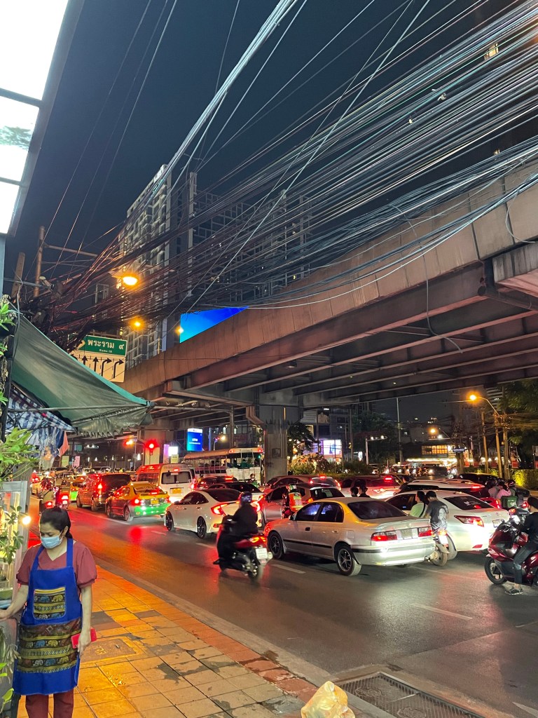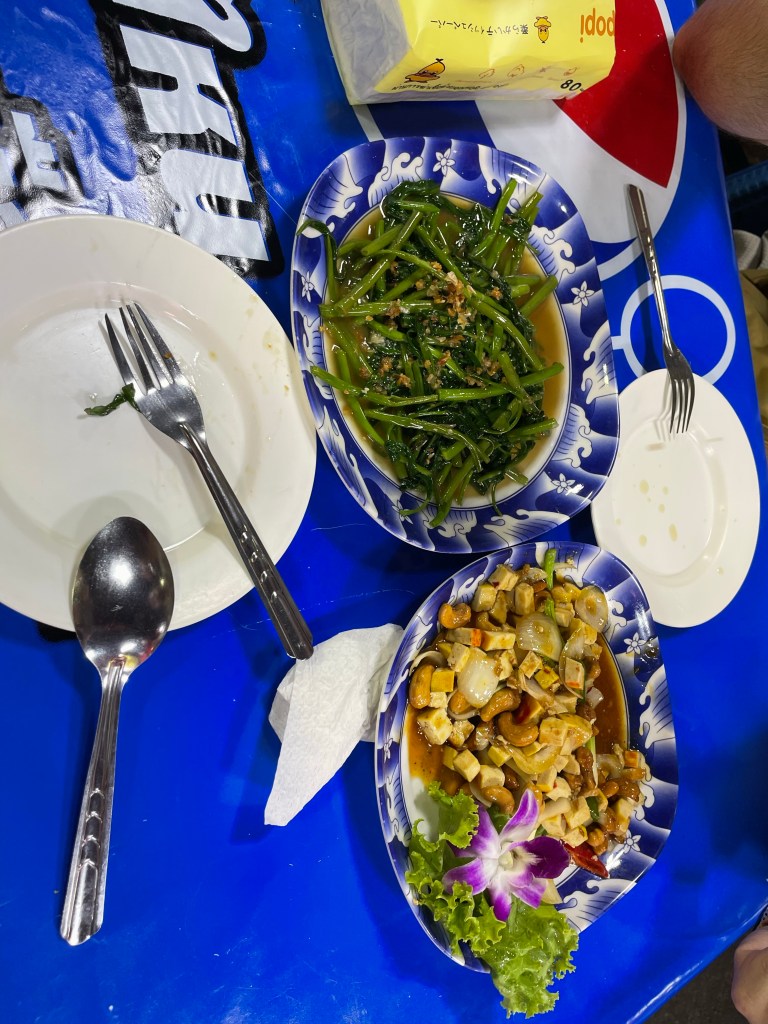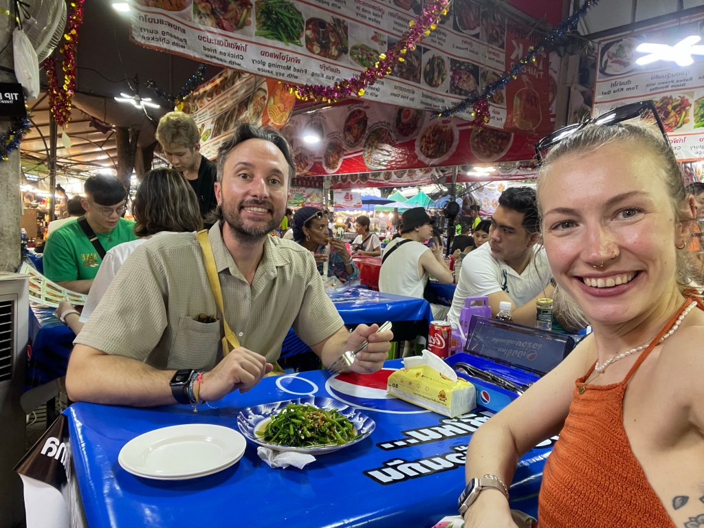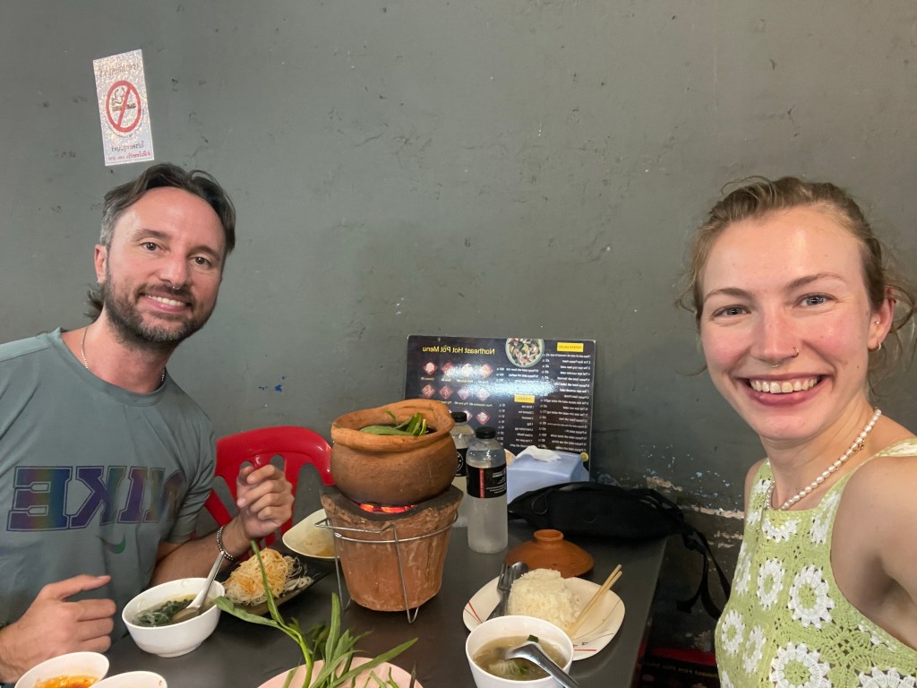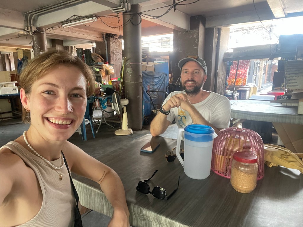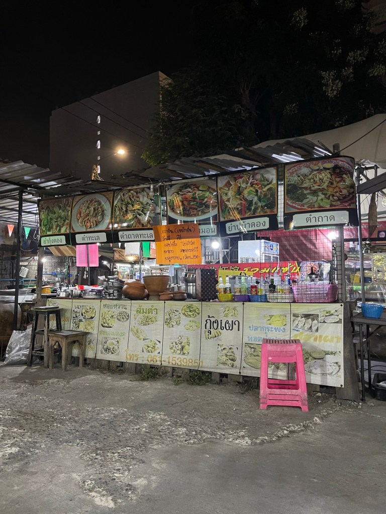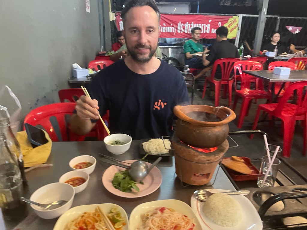 Nachdem die Rucksäcke abgelegt sind, gehen wir nach dem Tag im Bus erstmal eine Runde spazieren, die Füße vertreten und unsere neue Hood Din Daeng auskundschaften. Das Viertel ist ähnlich wie die Unterkunft: ganz ok, aber nicht sexy. Großes Highlight des Abends ist das Hot Pot Lokal genau gegenüber des Hotels, da gibt’s einen Hot Pot für Ben und für mich spicy salads. Wer mich kennt, weiß, wie sehr ich scharfes Essen liebe. Und ich bin -vermutlich weil ganz schön groggy- so mutig und bestelle mir in Thailand in einem local Restaurant (kein Touristen Spot) scharfes Essen… Es schmeckt großartig, aber ich vergieße so einige Tränen beim Essen, mein Mund fühlt sich an wie die Hölle höchstpersönlich und ich übe Resilienz auf höchstem Niveau, weil ich das Wasser vor mir natürlich gerne trinken möchte und es dennoch nicht tue.