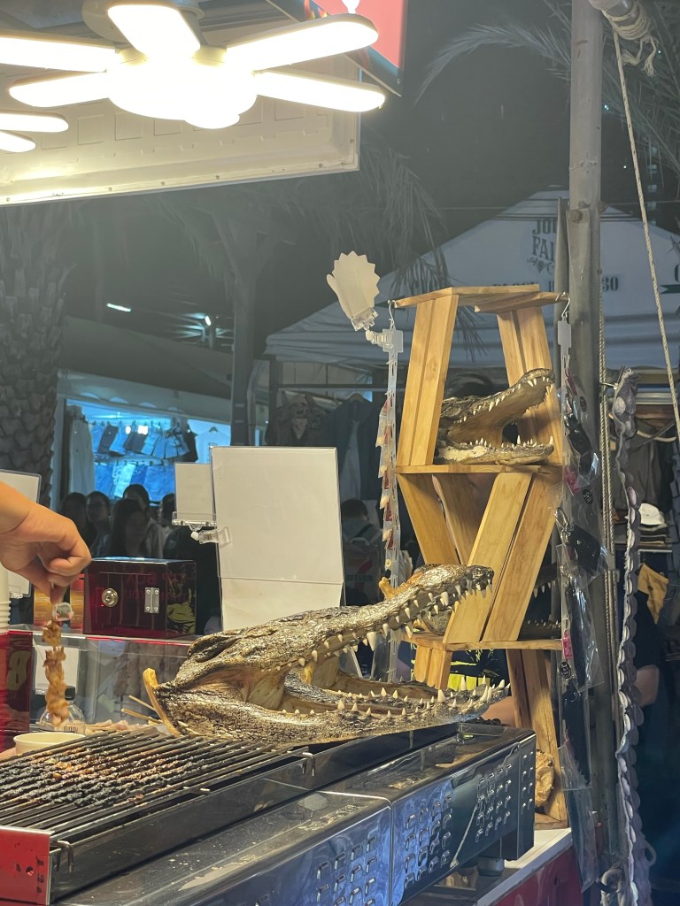 Nach dem Markt haben wir noch nicht genug von Menschenmassen und deshalb geht es für uns auf die Khao San Road, DIE Partymeile Bangkoks für Touristen. Ich fühle mich direkt zurückversetzt nach Phuket, denn laute Musik scheppert links und rechts aus den Clubs und Bars, dazwischen viele kleine Essensstände, Tarantel- und Skorpion-Snacks am Spieß und immer wieder Massagefabriken, wo man gemütlich bei 180 Dezibel Umgebungslautstärke neben 46 anderen Weißbroten massiert wird. Nice, das machen wir!