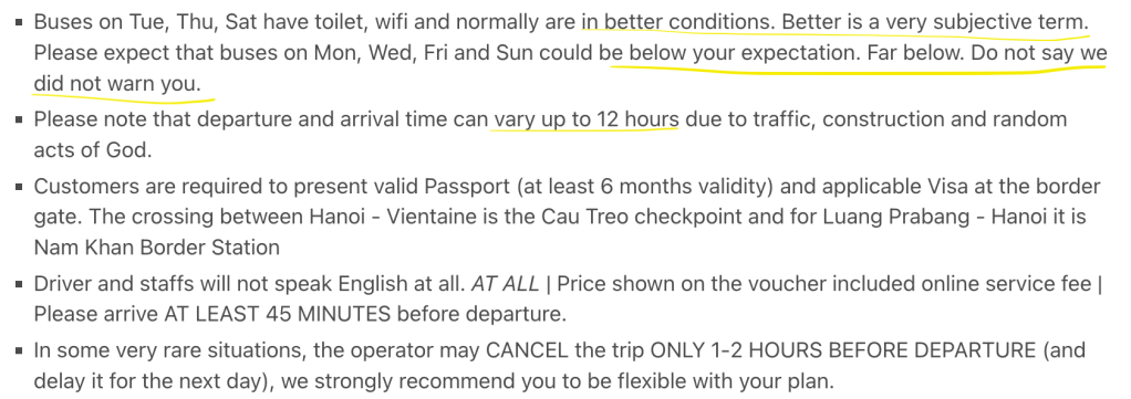 Aber nur eine Stunde Recherche später streichen wir auch Laos von der Liste. Das ist nämlich richtig viel Busfahren für gerade einmal eine Woche, die wir für Laos hätten. Das Verhältnis Bus:Aufenthalt wäre damit fast bei 1:1, ungeil. Außerdem wären die Aufenthalte eher Durchreise als „das Land entdecken“. Und nachdem sogar die Buchungsplattform 12goasia vor der Reise mit dem Bus von Laos nach Vietnam „warnt“, lassen wir das sein. Das ist im übrigen keine Warnung vor Kriminalität, sondern vor der Busfahrt selbst: