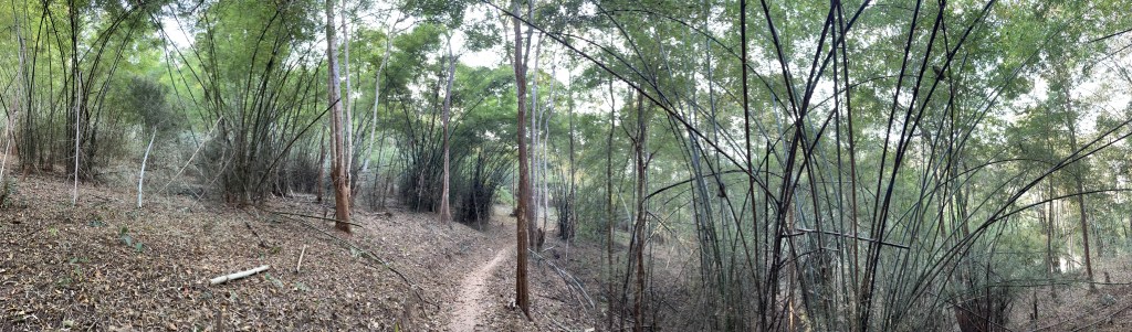 Wir bleiben zum Glück verschont, und bis auf ein paar kleinere Springspinnen auf dem Boden sehen wir keine anderen. Wir sehen zum Glück auch sonst nichts, was man im thailändischen Dickicht vermuten könnte. Liegt aber wahrscheinlich auch daran, dass uns die Naturbewohner schon 5km gegen den Wind gehört haben, weil das großblättrige Laub am Boden richtig Lärm macht beim Drübergehen.