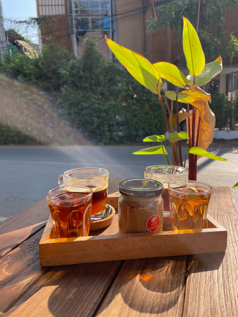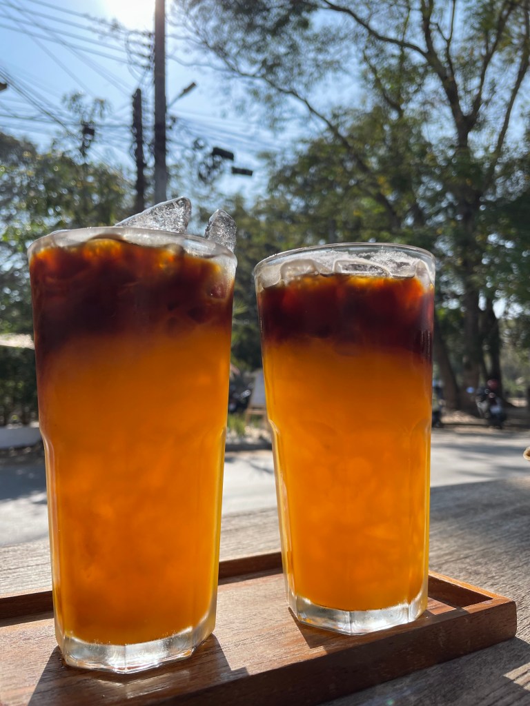 Aprospos Café: Orangen-Kaffee ist vor allem im Norden Thailands ein Ding und der absolute Knaller! Das ist -wie der Name schon vermuten lässt- Orangensaft mit schwarzem Kaffee (Americano). Meine erste Tasse in Chiang Mai fand ich ja doch eher gewöhnungsbedürftig, aber weil das immer so hübsch ausschaut im Glas, hab ich es eben doch nochmal versucht… zwischenzeitlich kann ich nicht mehr sagen, wieviele Orangen-Kaffees ich schon getrunken habe, aber das Zeug ist der Sh*t!