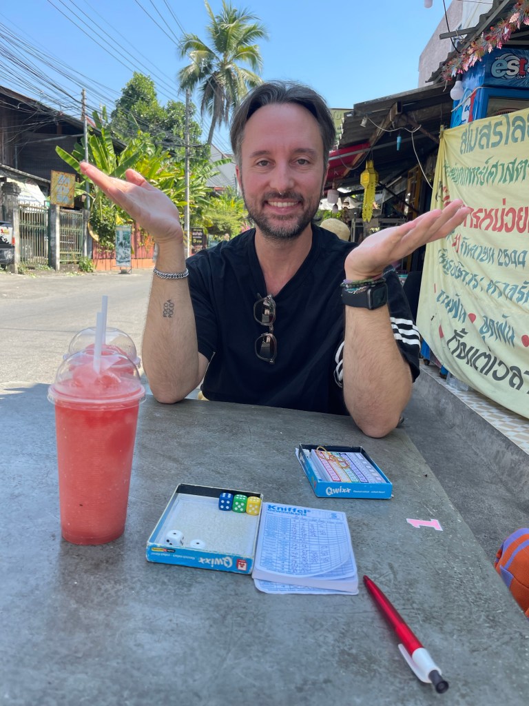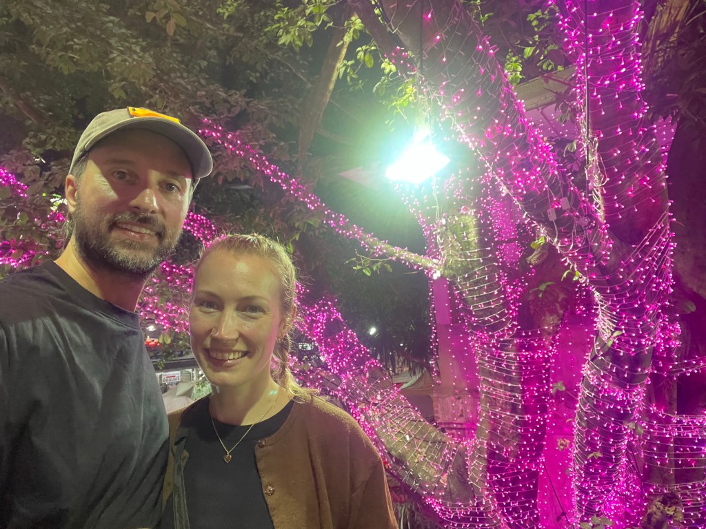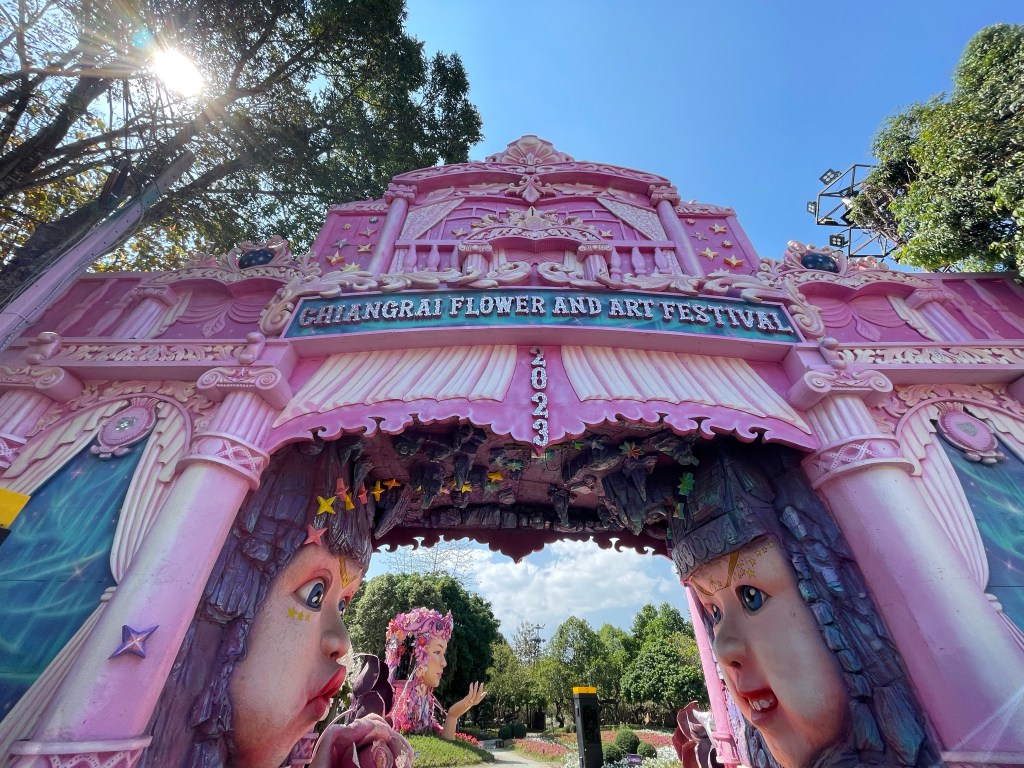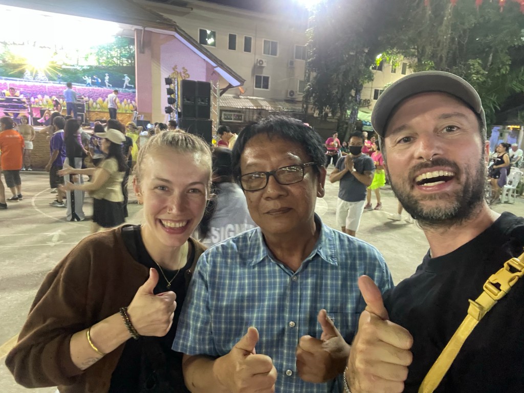 Nachdem die Rucksäcke ausgepackt sind, geht es zum Wochenend-Nachtmarkt – mal wieder einer. Hier findet auch gerade ein Flower Festival statt und wir bekommen den letzten Tag mit, an dem die Gärten hier geschmückt sind. Außerdem wird viel im Kreis zu Live-Musik getanzt und gelacht. Wir stehen am Rand und schauen den Tanzenden zu, und ein älterer Herr winkt uns in den Kreis dazu… Puh, ok. Ben hat an sowas ja sowieso Spaß – also ab dafür und ne Runde vortanzen vorm Rest vom Fest. Turns out, der ältere Herr ist Sportlehrer und er zeigt uns die Tanzschritte, so dass wir einigermaßen passabel mitkommen und ein paar Runden mit im Kreis tanzen. Zum Einstieg in Chiang Rai war das schon ziemlich nett hier!