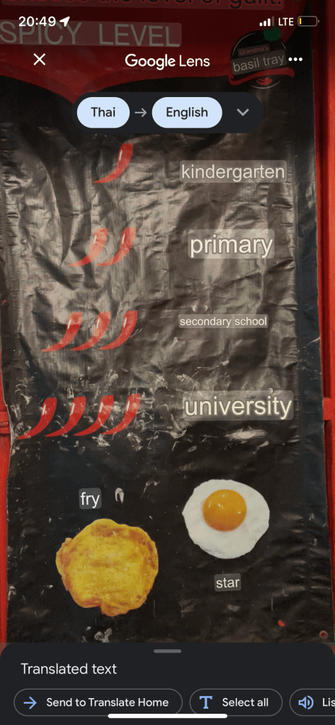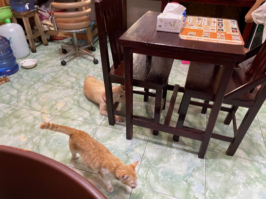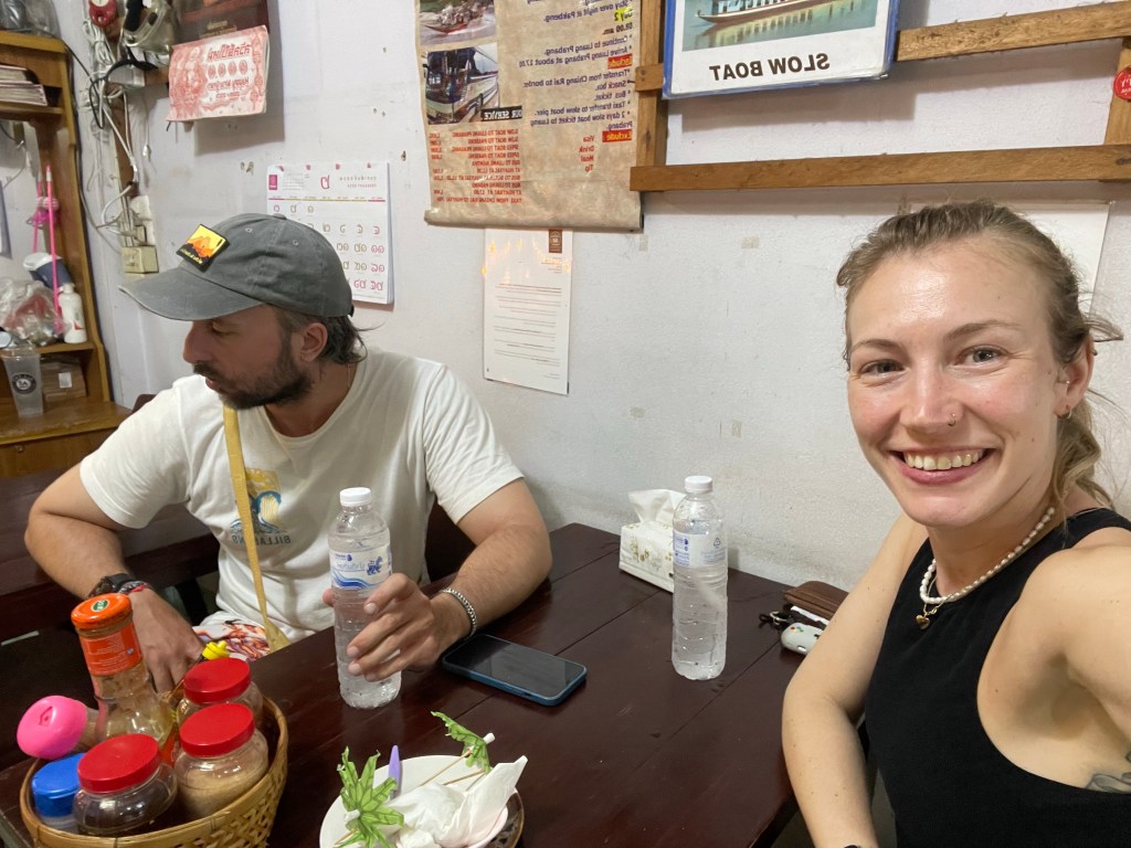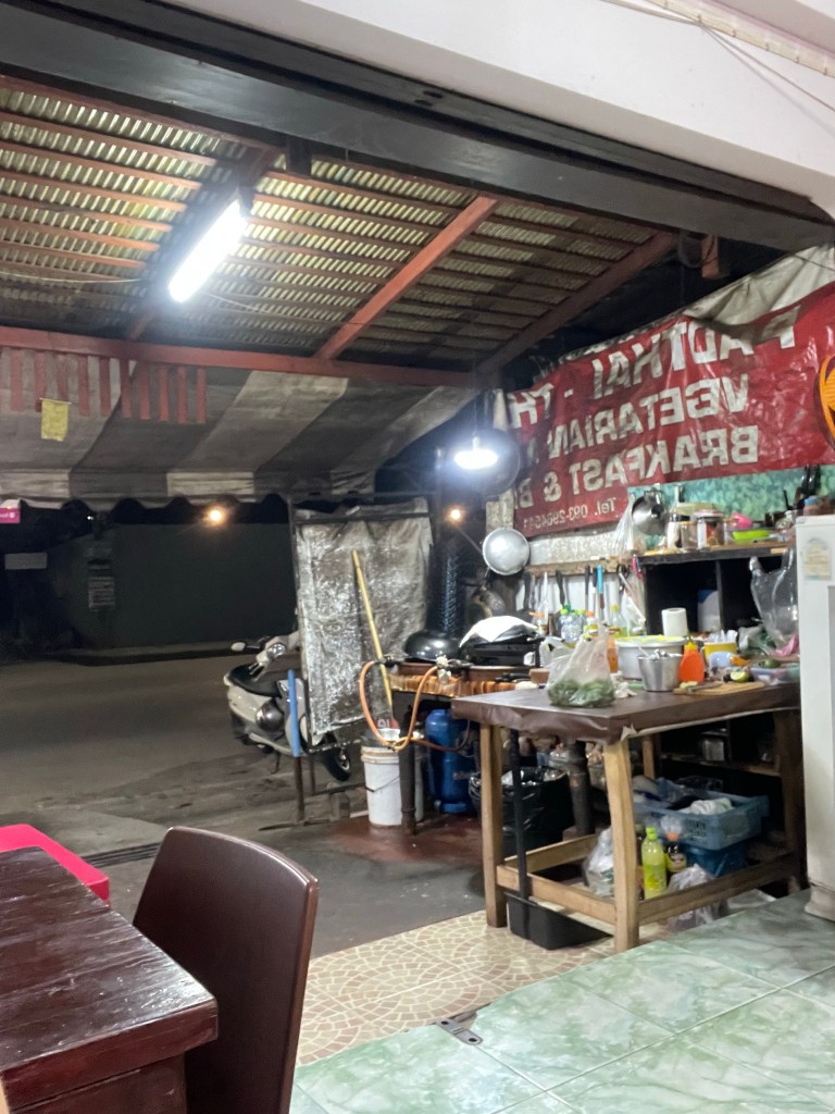 Abends landen wir in einem Lokal in der Nähe der Unterkunft und versuchen etwas zu essen zu bestellen – die Karte ist allerdings nur auf Thai und die Bedienung spricht soviel Englisch wie wir Thai sprechen… Eigentlich wollten wir noch einen Papaya Salat als Vorspeise, aber als Antwort bekommen wir nur zu hören, dass das Lokal in zwei Stunden schließt. Vermutlich sprechen die Bedienung und wir aneinander vorbei.