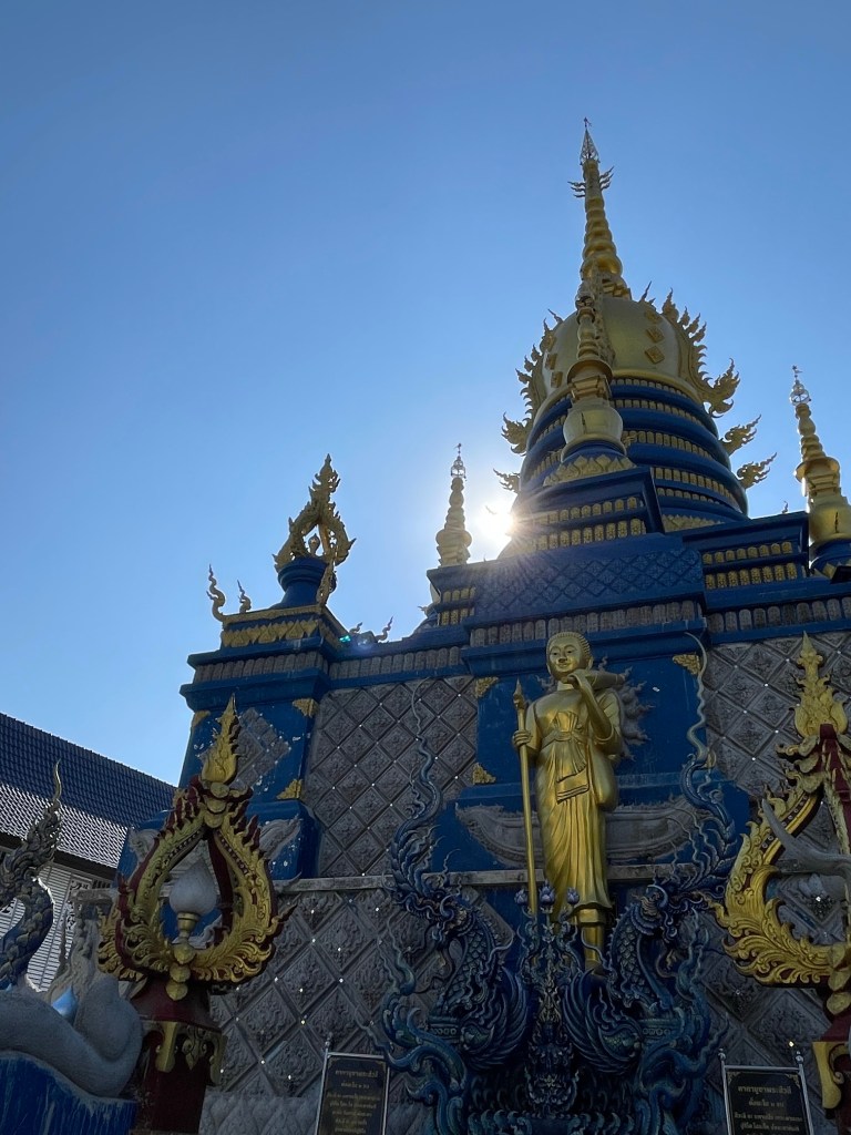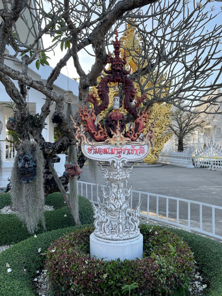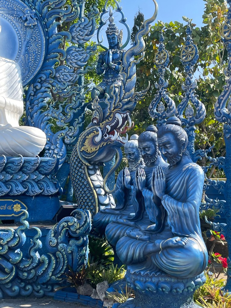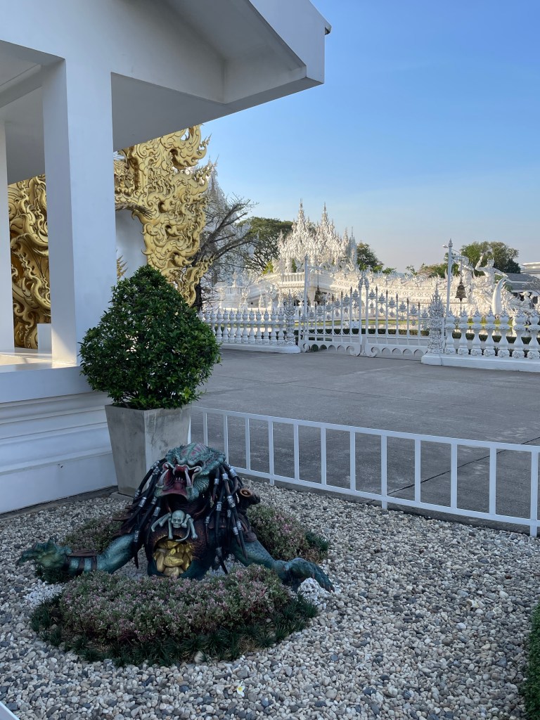 Der blaue Tempel ist noch einigermaßen tempelartig, wenn auch sehr touristisch. Der weiße und goldene Tempel sind aber irgendwie richtiger Quatsch – erstens kosten die Eintritt (unüblich für Tempel), außerdem sind um die Tempel herum Totenköpfe, Aliens und andere abartige Figuren gebaut. Es wirkt jedenfalls mehr wie Europa Park denn Gebetsstätte. Ganz nett zum Anschauen sind die Tempel, aber Ehrfurcht ob der Macht des Glaubens überkommt einen nicht dabei.
