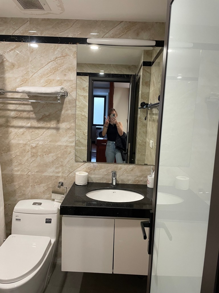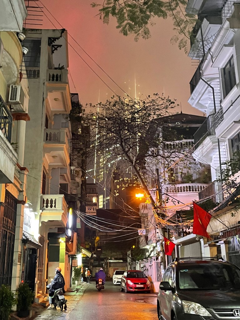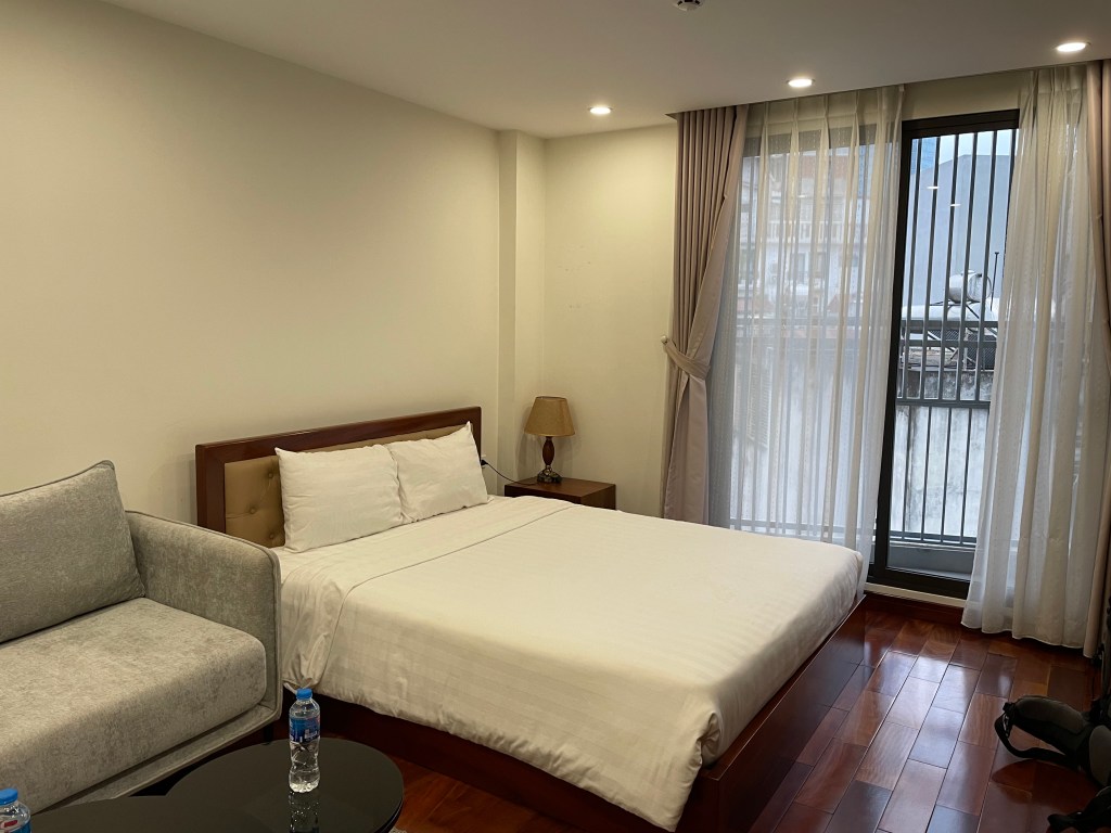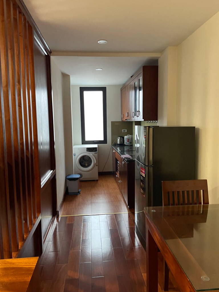 Asiatisch clever geschnitten, haben wir auf wenigen Quadratmetern in einer -technically 1-Zimmer-Wohnung- ein Schlafzimmer, ein Wohnzimmer, Küche, Esszimmer und Bad. Außerdem ist das die erste Unterkunft, in der alle Lichter inkl. der Deckenleuchte „schön“ sind (also kein kaltweißes Licht oder Flackerlichter, sondern gemütliches warmweißes Licht). Wir sind direkt schockverliebt und freuen uns auf die kommenden Tage in der vietnamesischen Hauptstadt, bevor unser Rollerabenteuer durch Vietnam losgeht – das angepeilte Herzstück der Reise!