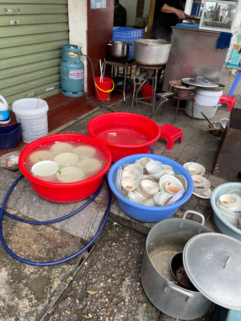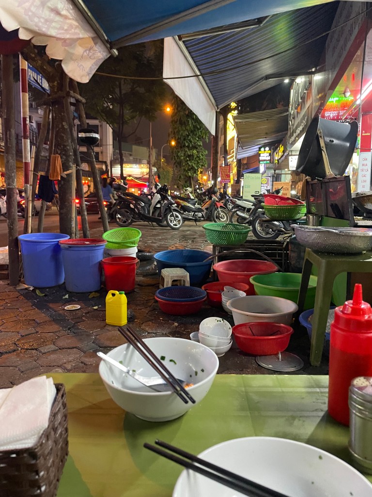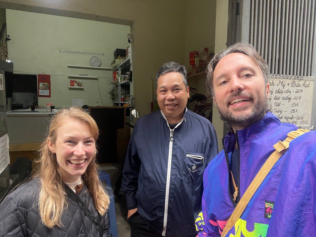 Wir erfahren außerdem, dass unsere Unterkunft im japanischen Viertel von Hanoi liegt, das erklärt auch die vielen Sushi Läden um uns herum. Als wir uns an einem Abend in einer der vielen kleinen Gassen fast verlieren, stehen wir auf einmal vor einem Vietnamesen, der Banh Mi verkauft… meistens ist hier schon die Verständigung auf englisch schwierig und wir nutzen Google Translate meist auf gut Glück. Aber mit unserem neuen Freund Hung ist das kein Problem – der kann nämlich unsere Bestellung auf deutsch entgegennehmen, er hat nämlich auf Norderney seine Gastro-Ausbildung gemacht und 20 Jahre dort gelebt. Zufälle gibt’s!