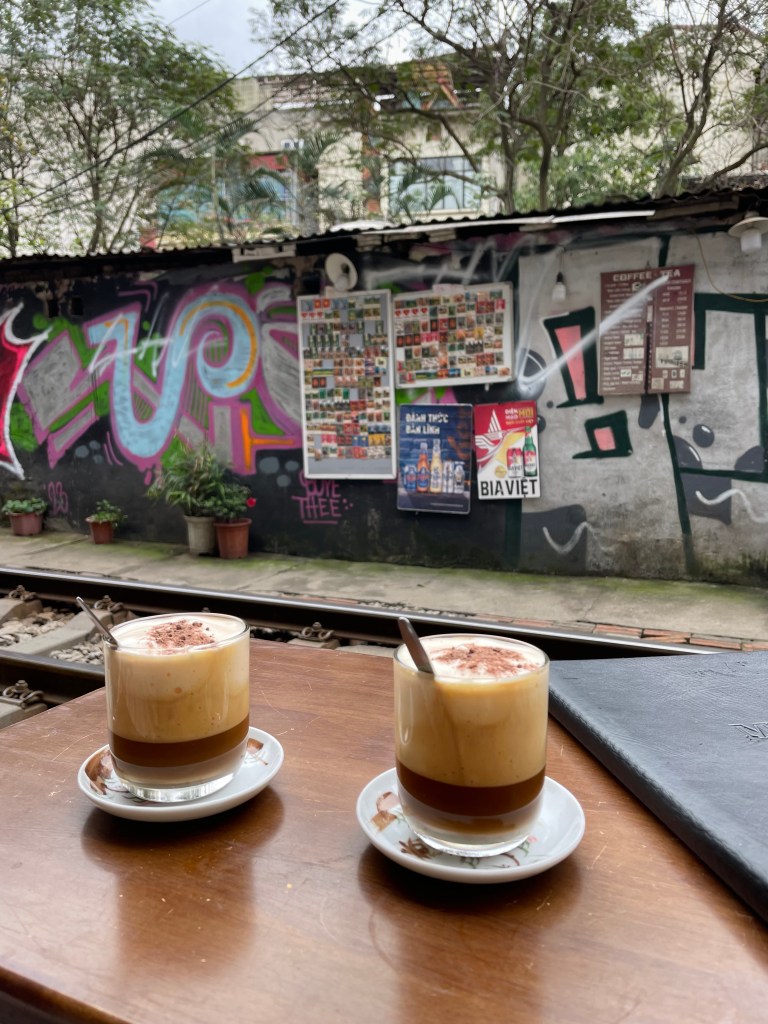 Neben dem salzigen Sahne-Kaffee haben wir auch den berühmten Egg-Coffee probiert. Und das auch noch in der Train Street: eine sehr schmale Straße durch die ein Zug durchfährt… und dafür, dass die Straße wirklich sehr schmal ist, fährt der Zug verdammt schnell! Hätt’s daheim so nicht gegeben.