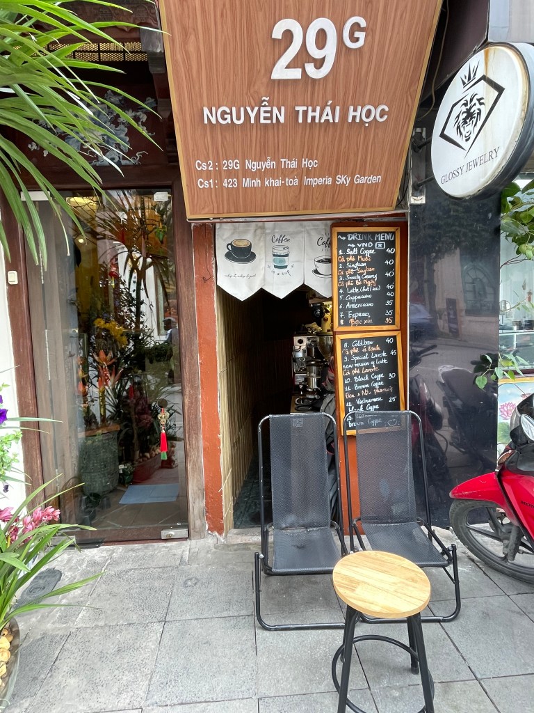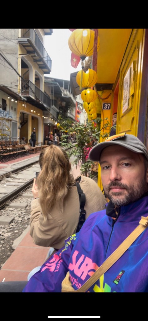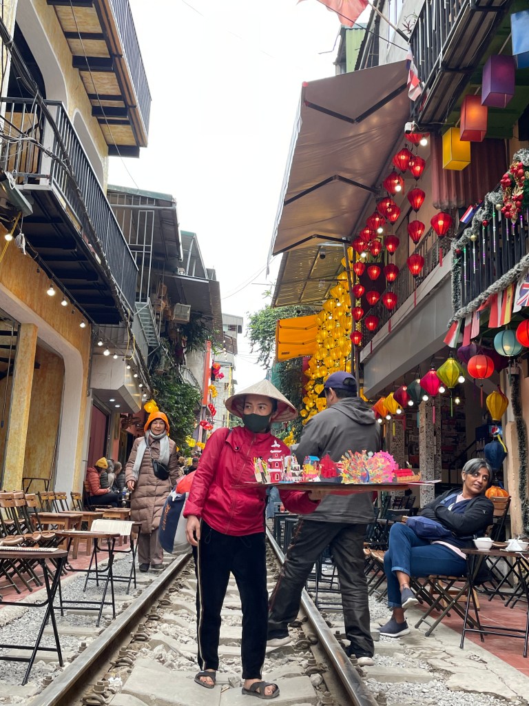 Aber eigentlich ist die Train Street aus Sicherheitsgründen für Touristen gesperrt und Wachen sind an den Eingangsstellen zur Train Street postiert. Die Cafébesitzer:innen in der Train Street leben aber von den Touris. Ihr seht das Dilemma. Es hat sich daher ein neues System eingebürgert: die Gastronom:innen bezahlen die Wachen nach Anzahl der Touris, die sie mit reingenommen haben. Das erklärt uns ein amerikanisch-vietnamesisches Pärchen, das wir beim Egg-Coffee kennenlernen.