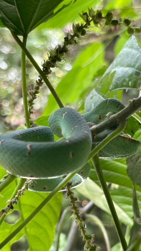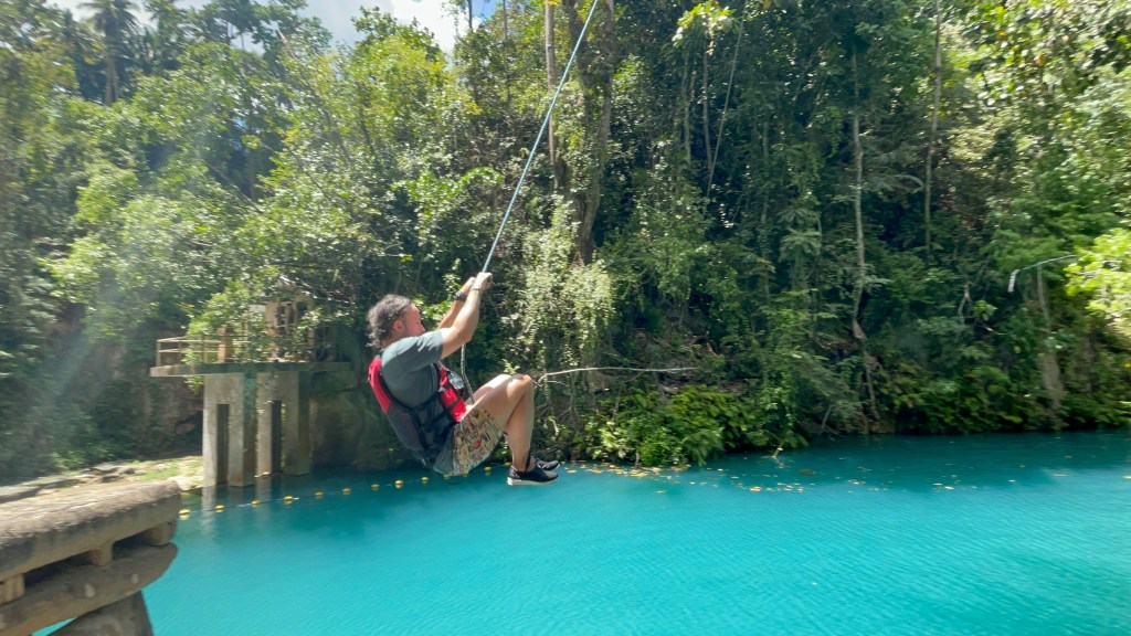 Zwischendurch erzählt er uns auch mehr zur Region, vor allem Taifun Odette vor zwei Jahren ist beherrschendes Thema. Er hat für massive Zerstörungen in den Siedlungen gesorgt und auch die Kawasan Falls wurden in Mitleidenschaft gezogen. Vieles musste „aufgeräumt“ und neu aufgebaut werden, auch der Fluss verlief vor Odette anders als wir ihn zu sehen bekommen… Das gesamte Areal muss vorher noch schöner gewesen sein, noch grüner, mehr Tiere, mehr Palmen. Für uns ist das schwer vorstellbar, wir finden es schon jetzt wunderschön!