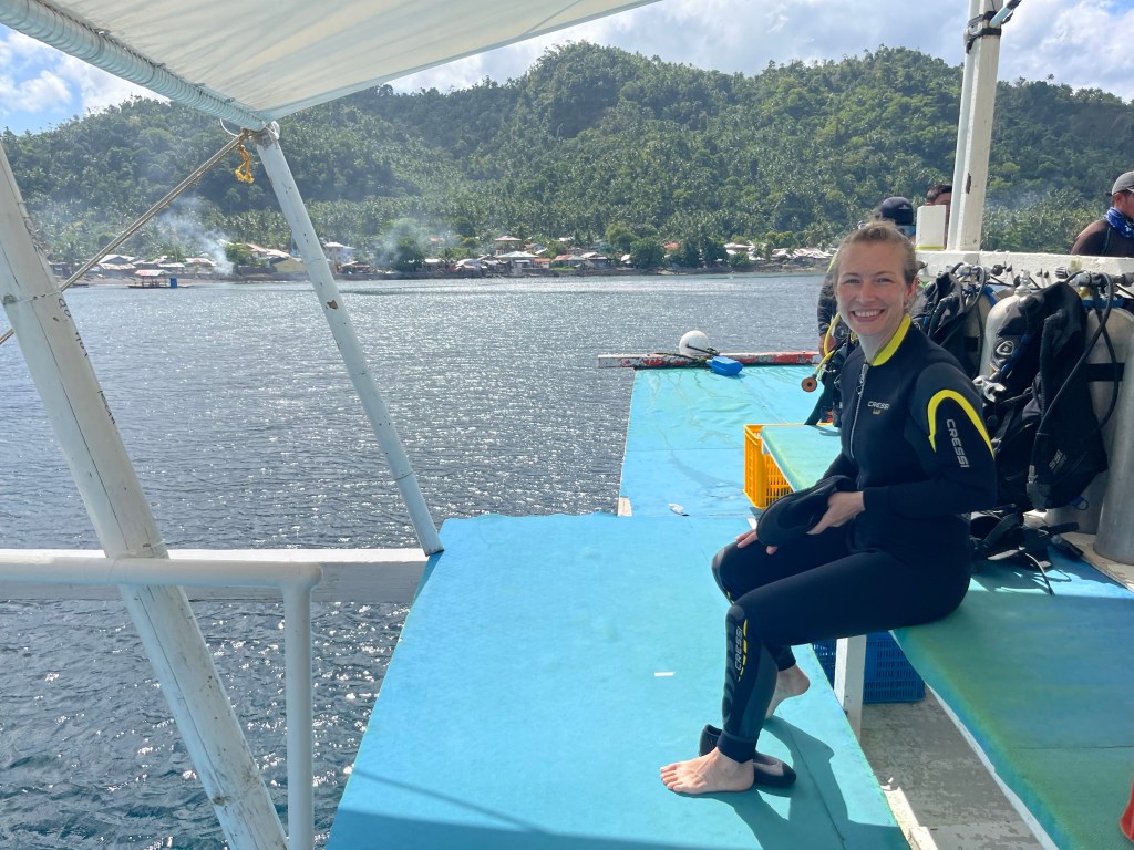 Um 8 Uhr ist Abfahrt mit beim Boot beim Resort, dann fahren wir raus in die Bucht und gehen unsere ersten beiden Tauchgänge für den Tauchschein an: Fish Identification und Peak Performance Buoyancy (basically, wie kommt man zum idealen Auftrieb und „liegt“ damit möglichst gut im Wasser).