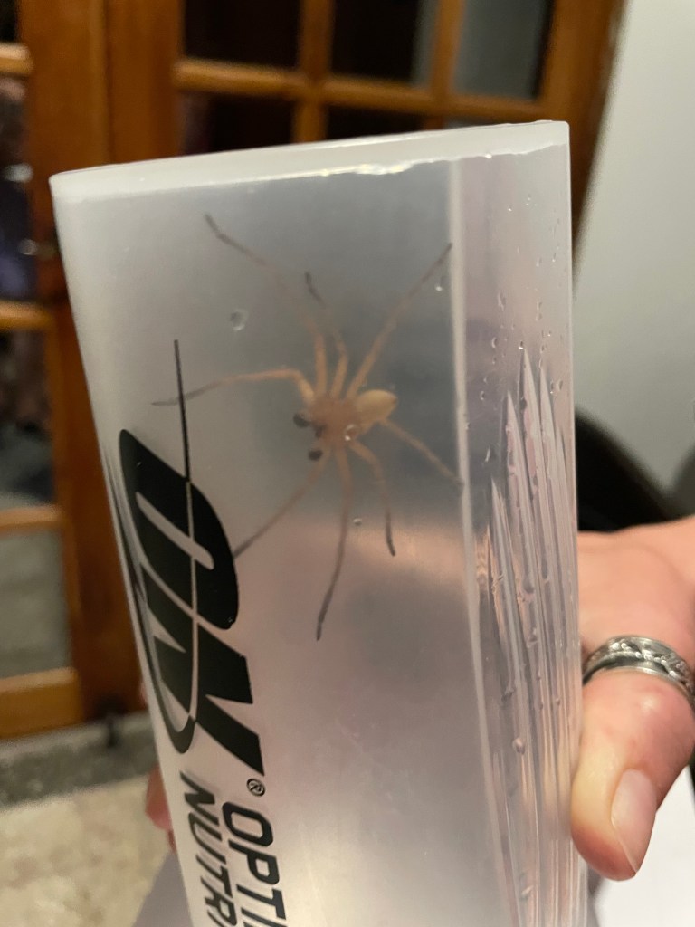 Erstmal geortet, wird unser neuer Freund erstmal eingefangen und flitzt wie ein Blitz durch den Becher. Ich bin mir nicht sicher, ob die Spinne Angst hat oder sprichwörtlich rasend vor Wut ist. So hektisch wie sie ihre Fänge bewegt, denke ich eher an Aggression. (Ja, natürlich beobachte ich sie, Spinnen sind zwar nicht meine Lieblingstiere aber doch irgendwie faszinierend).