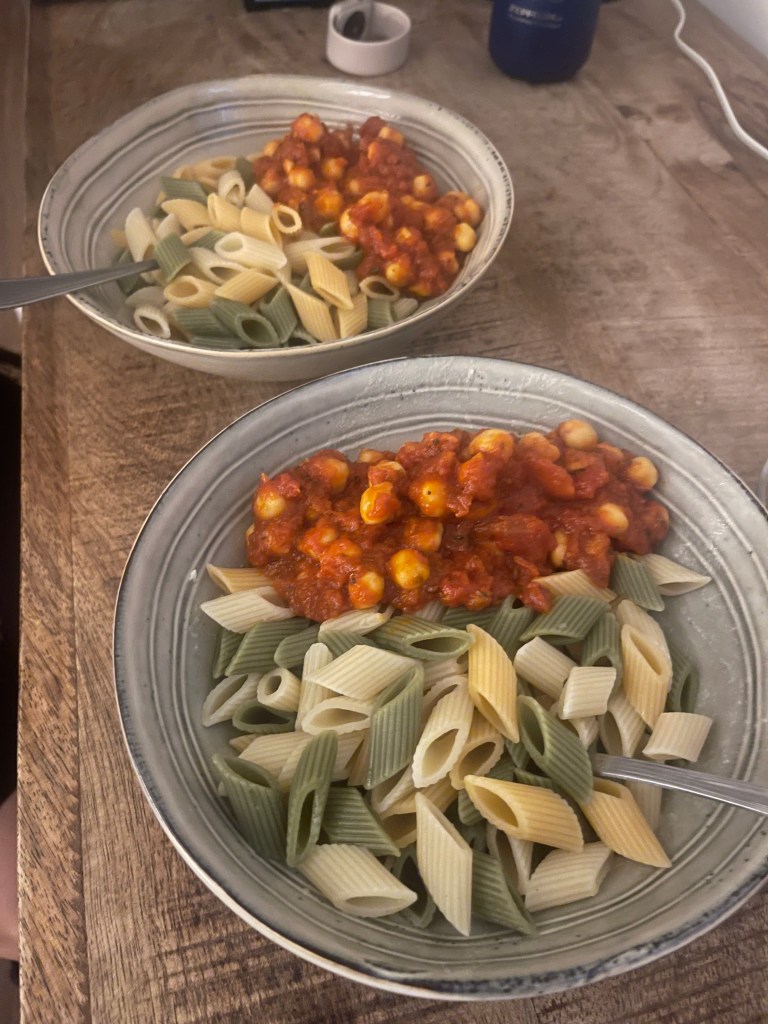 Also probiere ich den labbrigen Haut-/Fleisch-/Sonstwas-Lappen: „Wuäh“ als Kurzfassung trifft es am ehesten. Die Soße drumrum ist gut, die Kichererbsen picken wir raus, aber mehr als zwei Stückchen bekomme ich nicht runter. Ben ist tapfer und versucht auch mal, aber auch er kriegt es nicht runter. Schade, die Schale geht also noch halb gefüllt wieder zurück. 😢