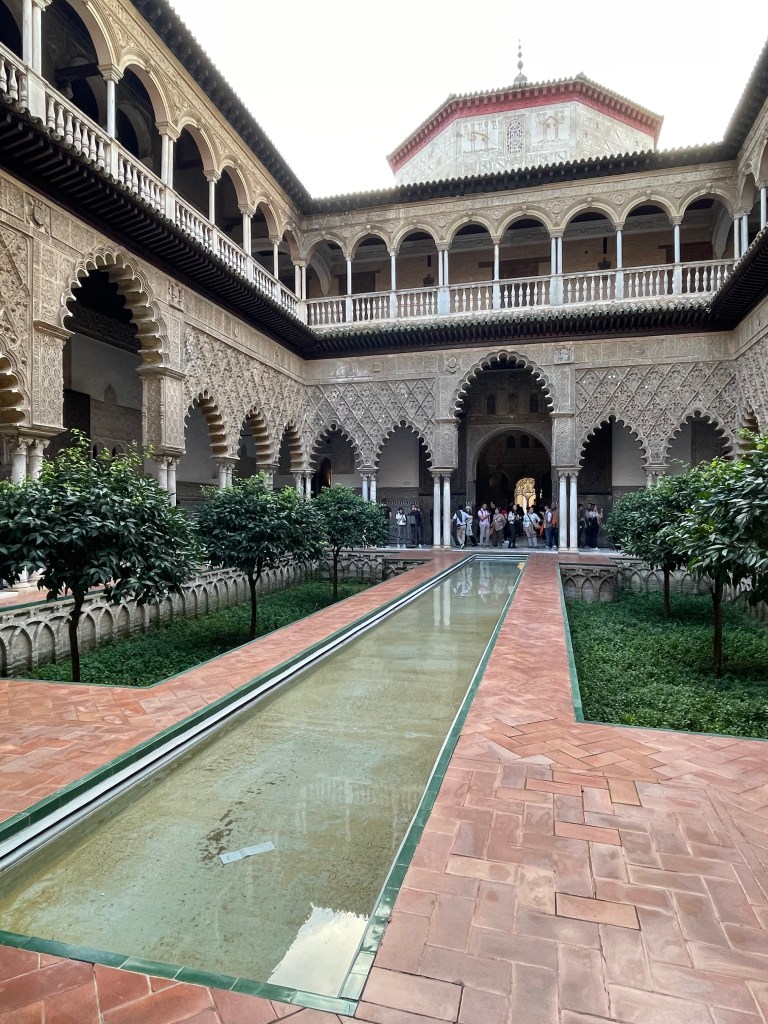Freitags nach Vorlesungsende und zum Start ins Wochenende legen wir direkt los mit dem Touri Programm: wir haben einen Zeitslot im Real Alcázar am Nachmittag ergattert und schauen uns den königlichen Palast an. Ursprünglich als maurisches Fort mit islamischen Einflüssen errichtet, wurde er konstant erweitert und ab dem 13. Jahrhundert dem christlichen Kulturkreis zu Eigen gemacht. Noch heute weilt dort die spanische Königsfamilie, wenn sie sich in Sevilla aufhalten.