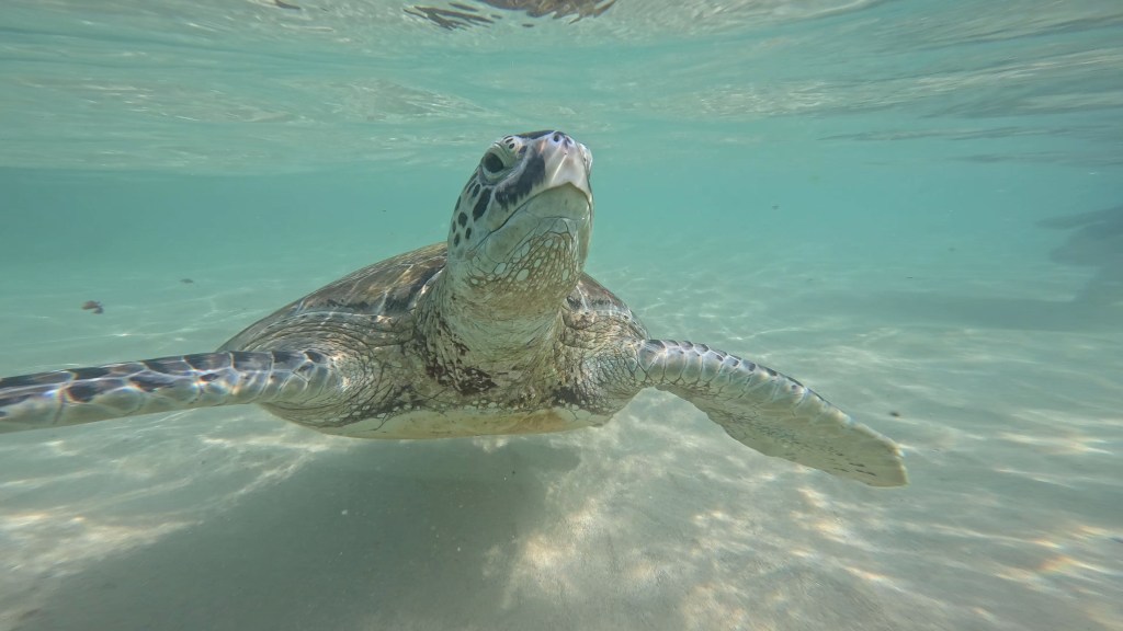 Die Woche startet grandios. Noch bevor wir unsere Unterkunft verlassen haben auf dem Weg zum Strand, können wir drei Äffchen in den Bäumen aus nächster Nähe beobachten. Am Turtle Beach geht es dann etwa genau so weiter und wir können mit drei großen Schildkröten schnorcheln am Turtle Beach. Der Vollständigkeit halber: der Strand ist bekannt für seine Schildkrötenbesucher, denn durch einen Felsvorsprung ist hier das Wasser am Strand sehr ruhig und bekommt kaum Wellen ab… und es gibt Locals, die Seetang an die Touristen verkaufen, um damit die Schildkröten zu füttern. Das nervt natürlich irgendwie, aber immerhin ist es „nur“ Seetang. Wir kaufen kein Futter und freuen uns einfach so über die Schildkröten in Strandnähe. Wir schnorcheln außerdem ein bisschen raus, beobachten Papageifische (immer noch mein absoluter Lieblingsfisch mit seinem schnabelartigen Mund und den bunten Schuppen), naso unicornis Fische und noch ein paar andere Fische, die ich leider nicht im nachgang identifizieren konnte.