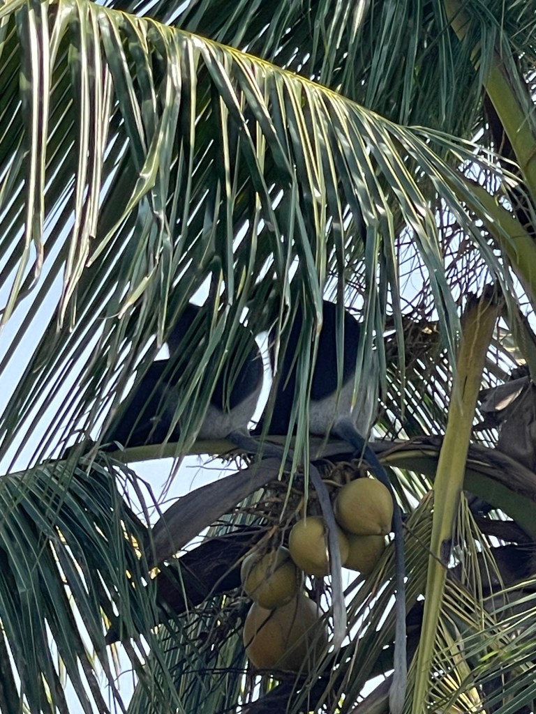 Während ich mich von den humanen Teilnehmern des Kurses verabschiede nach unserer letzten gemeinsamen Vorlesung, arbeitet Ben mit den beiden animalen COOs of Snack auf der Terrasse zusammen. Das sind die beiden Äffchen, die in der Palme neben der Dachterrasse sitzen und vor sich hin futtern.